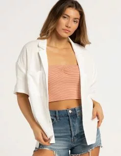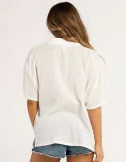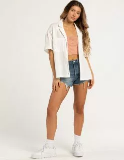 Full Tilt Gauze Boyfriend Shirt. Solid color gauze shirt. Button down front. Notch collar. Chest patch pockets. Short sleeve. Straight hem. Side vents. Loose fit. 100% Cotton. Machine wash. Imported.