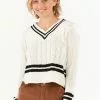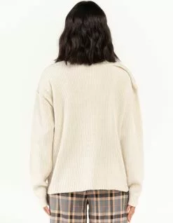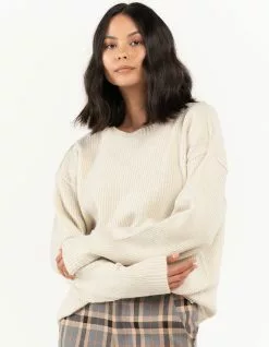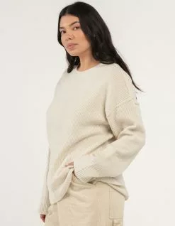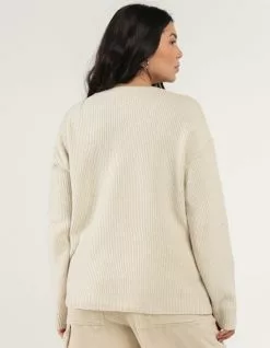 Full Tilt Pullover Sweater. Solid color. Ribbed sweater knit. Exposed seams on sleeves. Cuffed long sleeves and hem. Crew neckline. Long sleeves. 77% Recycled polyester 21% Nylon 2% Spandex. Machine wash. Imported.