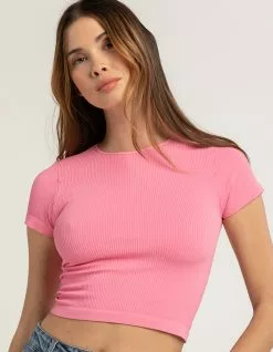 Full Tilt Seamless Baby Tee. Stretch rib knit construction. Crewneck. Short sleeve. Fitted silhouette. Cropped fit. 92% Nylon, 8% Spandex. Hand wash. Made in USA.
