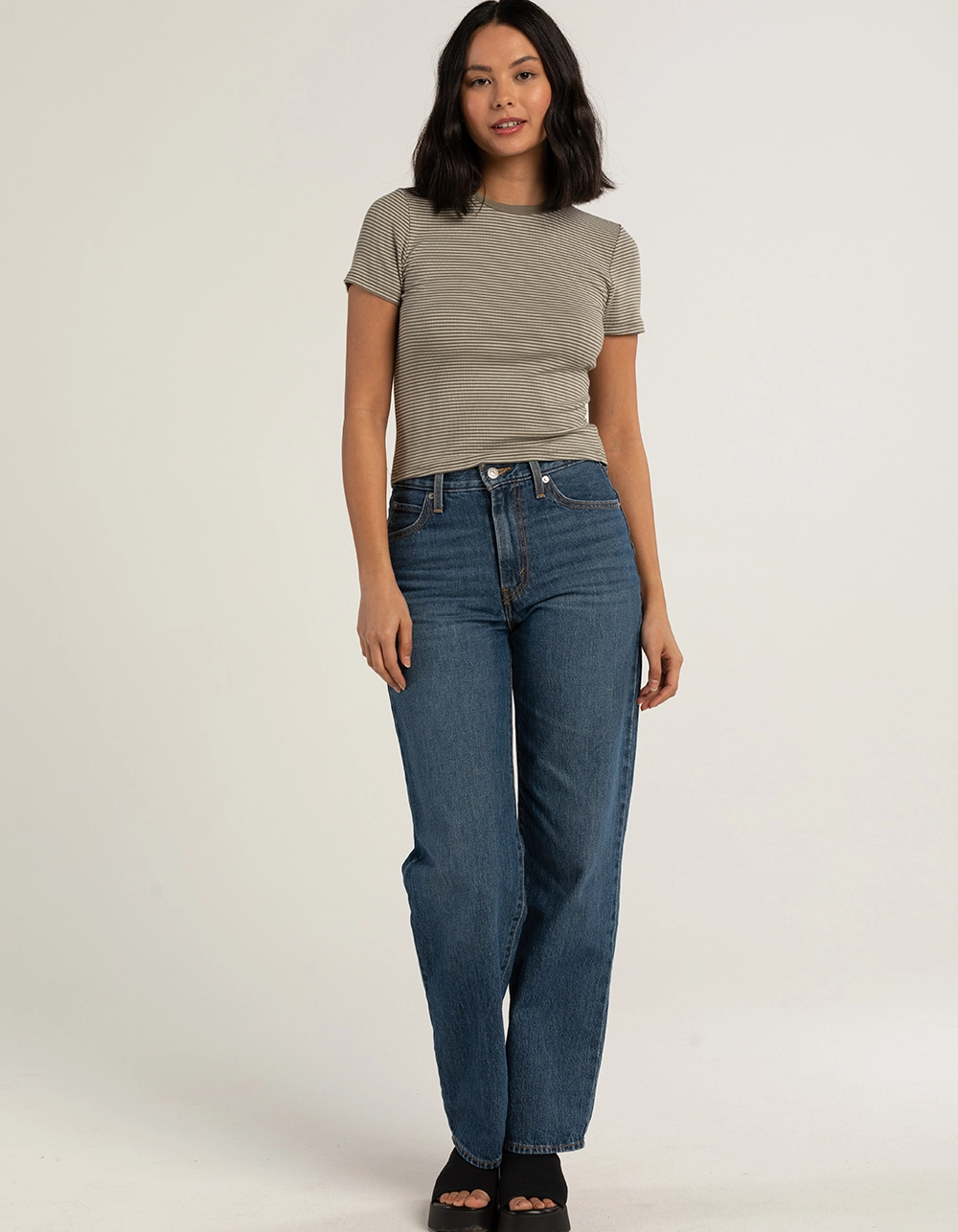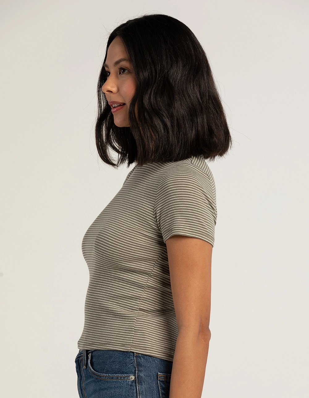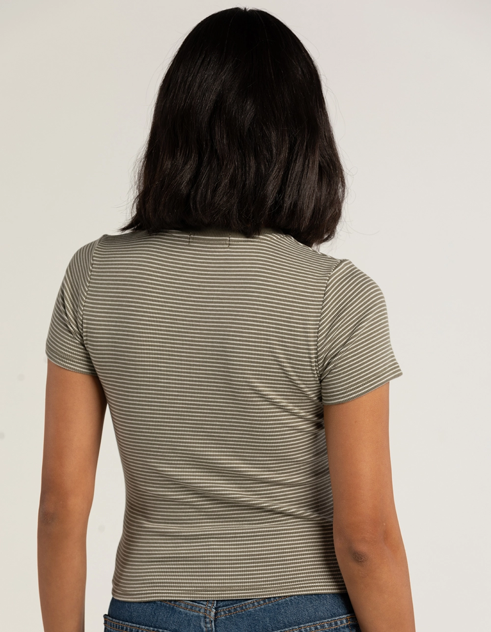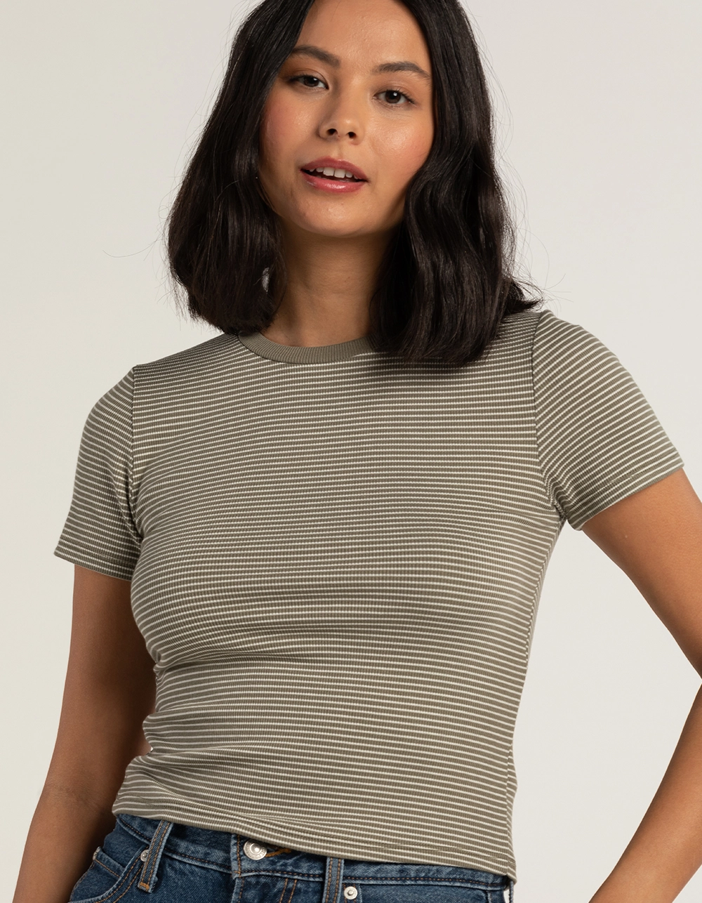 Full Tilt Stripe Ringer Tee. Rib knit construction. Ribbed crew neckline. Short sleeve. Cropped fit. 66% Rayon, 29% Polyester, 5% Spandex. Hand wash. Imported.