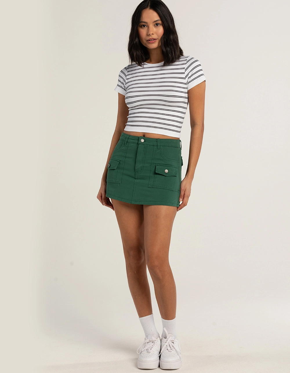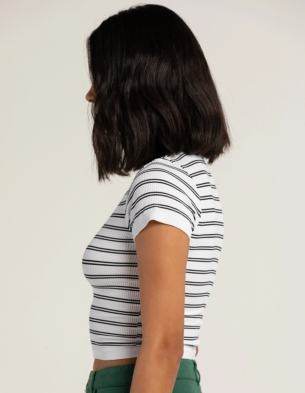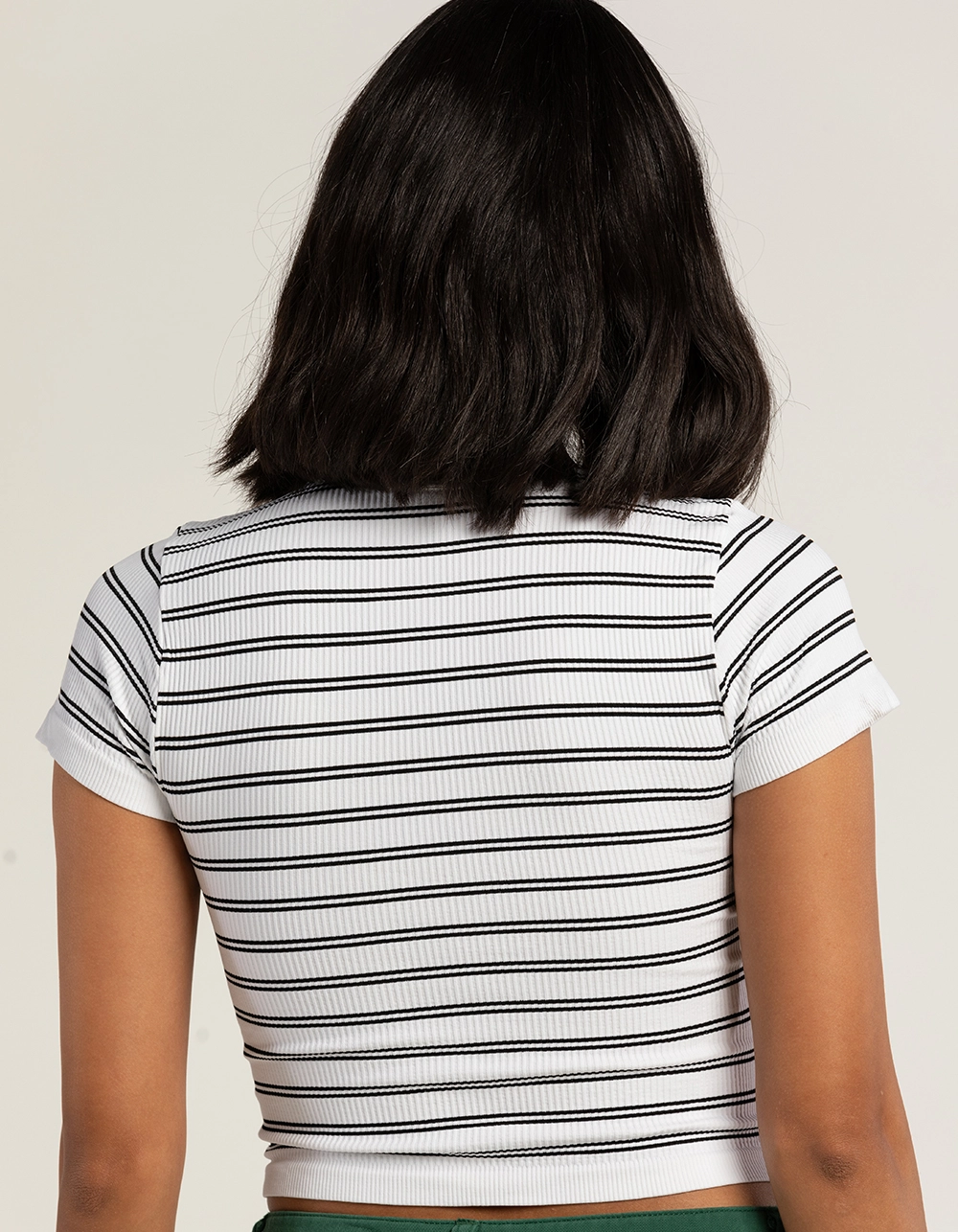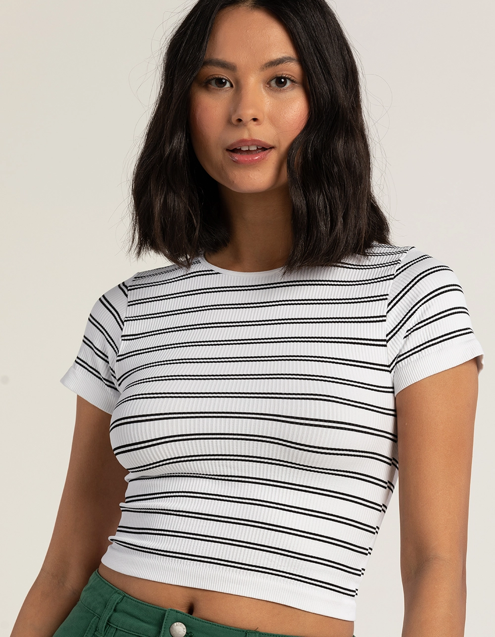 Full Tilt Stripe Seamless Baby Tee. Allover stripe pattern. Rib knit construction. Short sleeve. Fitted silhouette. Cropped fit. 92% Nylon, 8% Spandex. Hand wash. Made in U.S.A.