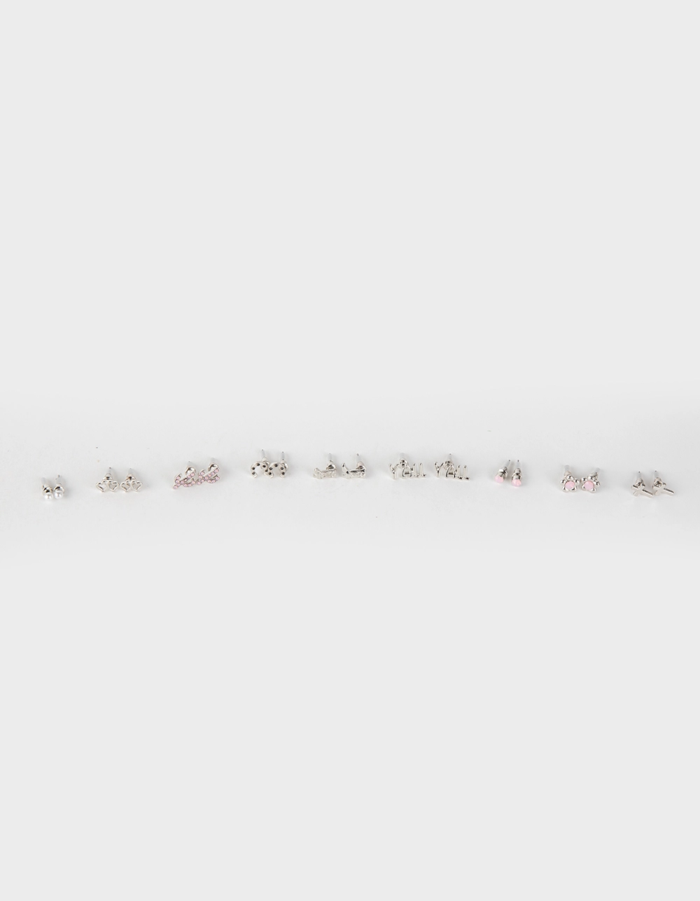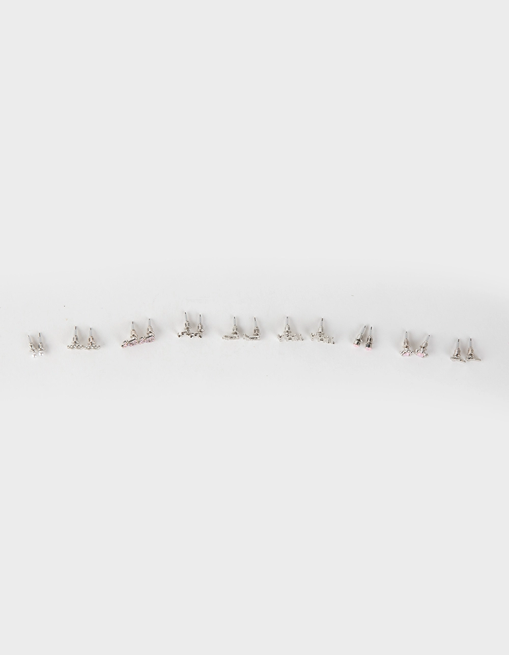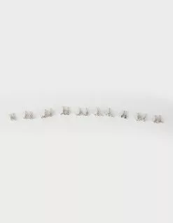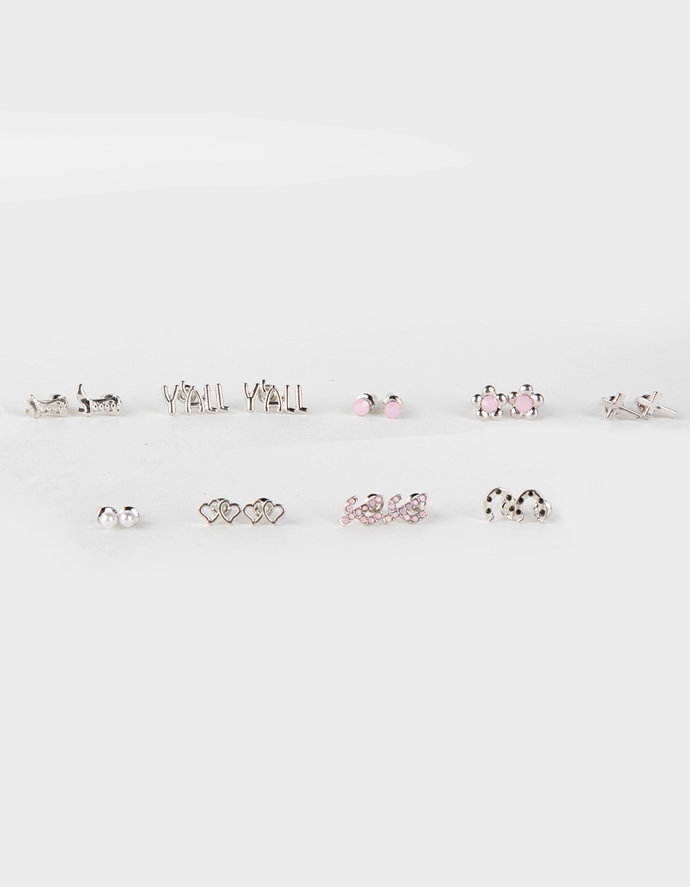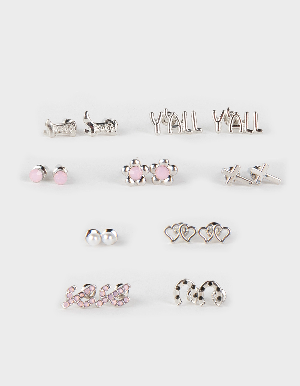 Full Tilt 9 Pack Yall Boot Earrings. Various shaped stud earrings with post back closures. Silver tones. Imported.