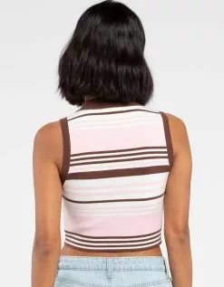 Full Tilt Zip Front Sweater Polo Shirt. Striped polo shirt with ribbed collar. Zip front placket. Sweater Knit. Sleeveless. 49% Viscose 30% Polyester 21% Nylon. Hand wash. Imported.