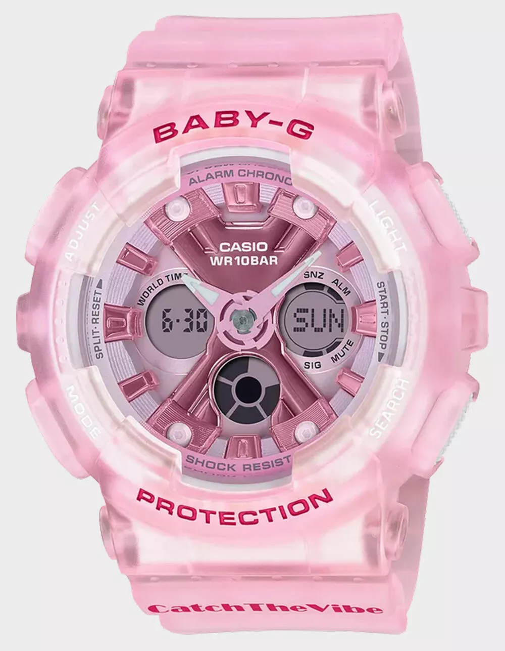 G-Shock Baby-G BA130CV-4A Light Pink Watch. Get hip-hop retro with dance-inspired pink jelly BA130CV-4A designed in collaboration with RIEHATA. The world-renowned dancer and choreographer provides an all new look to these BA130 watches, adding her unique touch to the iconic oversized cases. RIEHATA contrasts the mannish design with bands in translucent blue and pink and turns up the beat with electrifying metallic accents for the watch face. The “Catch The Vibe” message printed on the watchbands embodies the hip-hop culture of the ’90s and early 2000s, bringing back that edgy retro vibe in a truly special timepiece. This BABY-G will get your heart racing and ready for dance mode. Resin band. Neobrite. Shock resistant. Mineral glass. 100 meter water resistance. Imported.