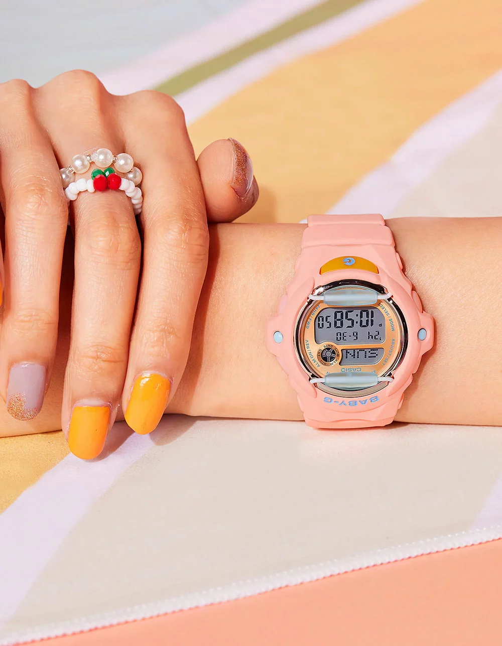 G-Shock Baby-G BG-169PB-4 Watch. Dive into summer fun with a playful, casual, active BABY-G in a color scheme that will send you soaking up the sun. The BG-169, with its charmingly compact design, takes on colors that playfully celebrate the beach. Soft coral pink celebrates the warmth of an ocean reef teeming with life. This fun design is sure to brighten your day. Bring the beach to your wardrobe and get your summer started. Playful, yet still practical. The shock-resistant structure stands up to bumps and scrapes, and water resistance up to 200 meters means you can even swim with it on.