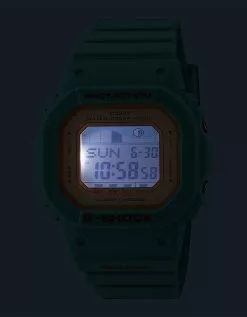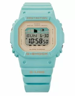 G-Shock GLXS5600-3 Watch. Case size: 45.7 x 40.5 x 11.9mm. Weight: 41g. Bio-based resin case & bezel. Bio-based resin band. Shock resistant. 200-meter water resistance. Approximate battery life: 3 years on CR1616. World time with 29 time zones (48 cities). Moon data (moon age of the specific date, moon phase graph). Tide graph (tide level for specific date and time). 1/100-second stopwatch. Countdown timer. 3 multi-function alarms (with 1 snooze alarm). Flash alert (LED indicator). LED backlight. Full auto-calendar (to year 2099). 12/24-hour format. Accuracy: +/- 15 seconds per month. Imported.