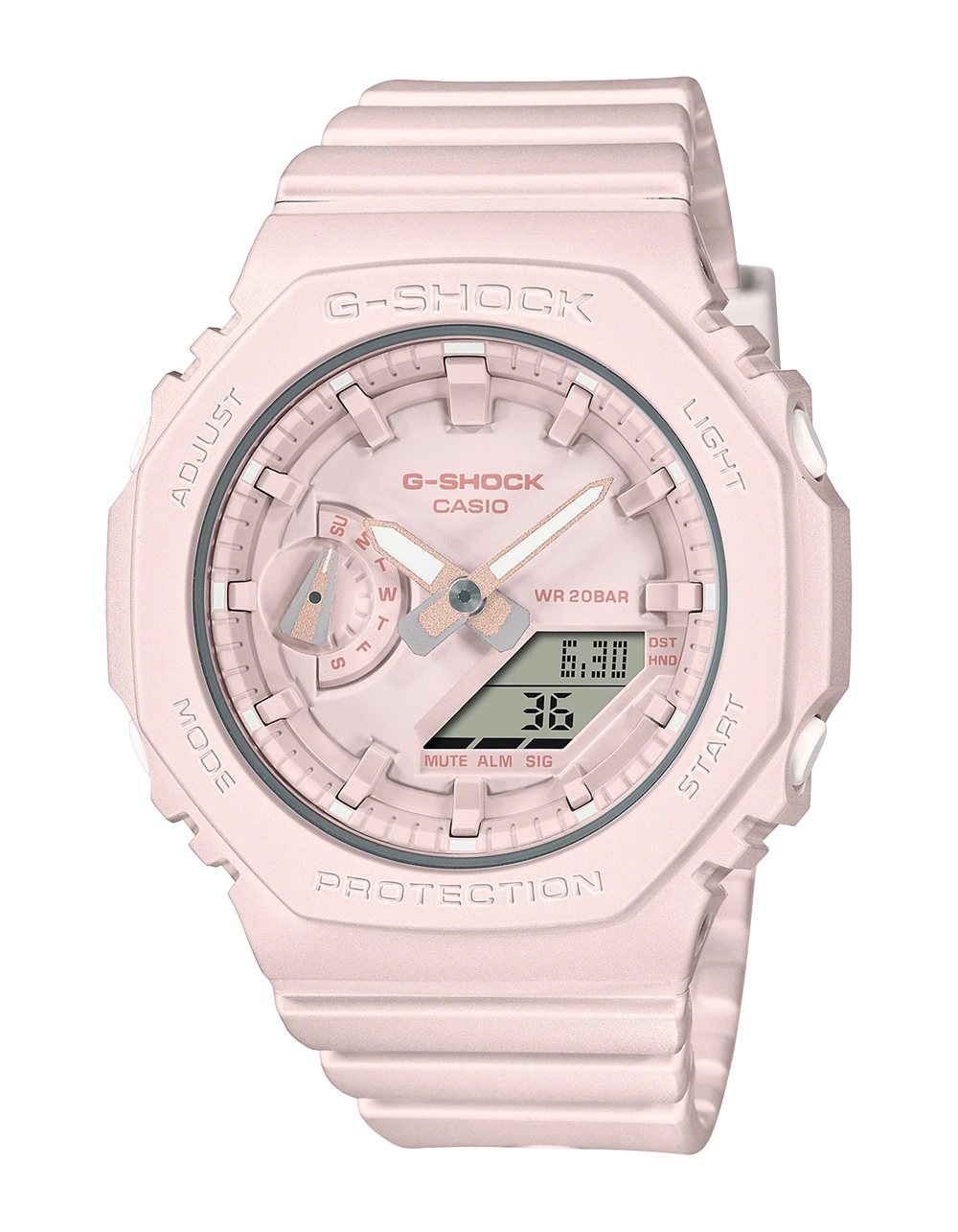 G-Shock GMAS2100-4A Watch. Simplify your life with the popular analog-digital combination GMAS2100. The same tough construction of the original GA2100, but in an even slimmer, more compact design. The flat watch face and simple bar indexes project a minimalist look and feel that shows you know right where you’re going. A casual, comfortable G-SHOCK in stylish solid colors. 46.2 × 42.9 × 11.2 mm case size. Case / bezel material: Carbon / Resin. Resin Band. Shock Resistant. 200-meter water resistance. Approx. battery life: 3 years on SR726W X 2. Stopwatch. Timer. Alarm/hourly time signal. Imported.