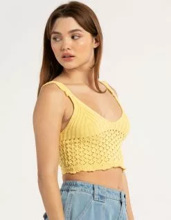 Generation K Crochet Tie Back Top. Crochet top. V-neckline. Scalloped trim on shoulder straps and hem. Tie back closure. Cropped fit. 100% Cotton. Hand wash. Imported.