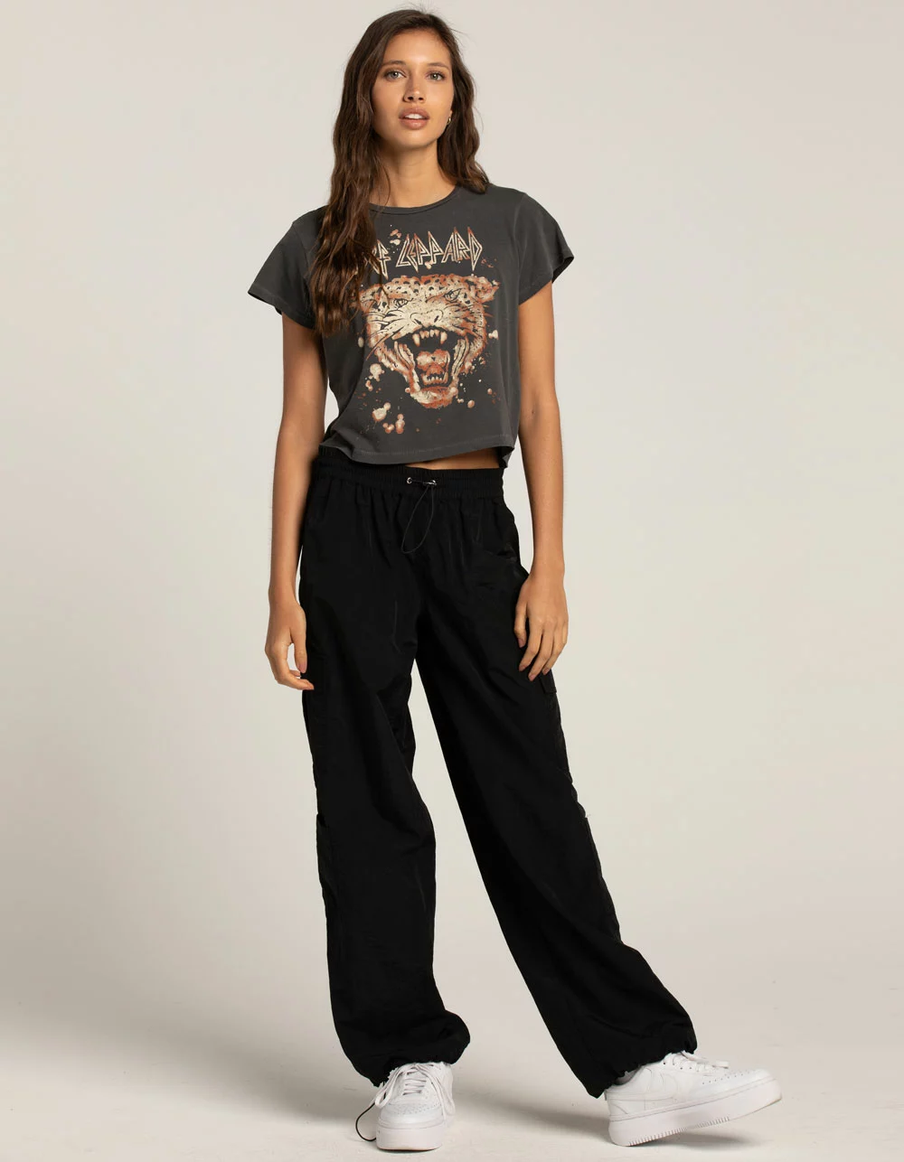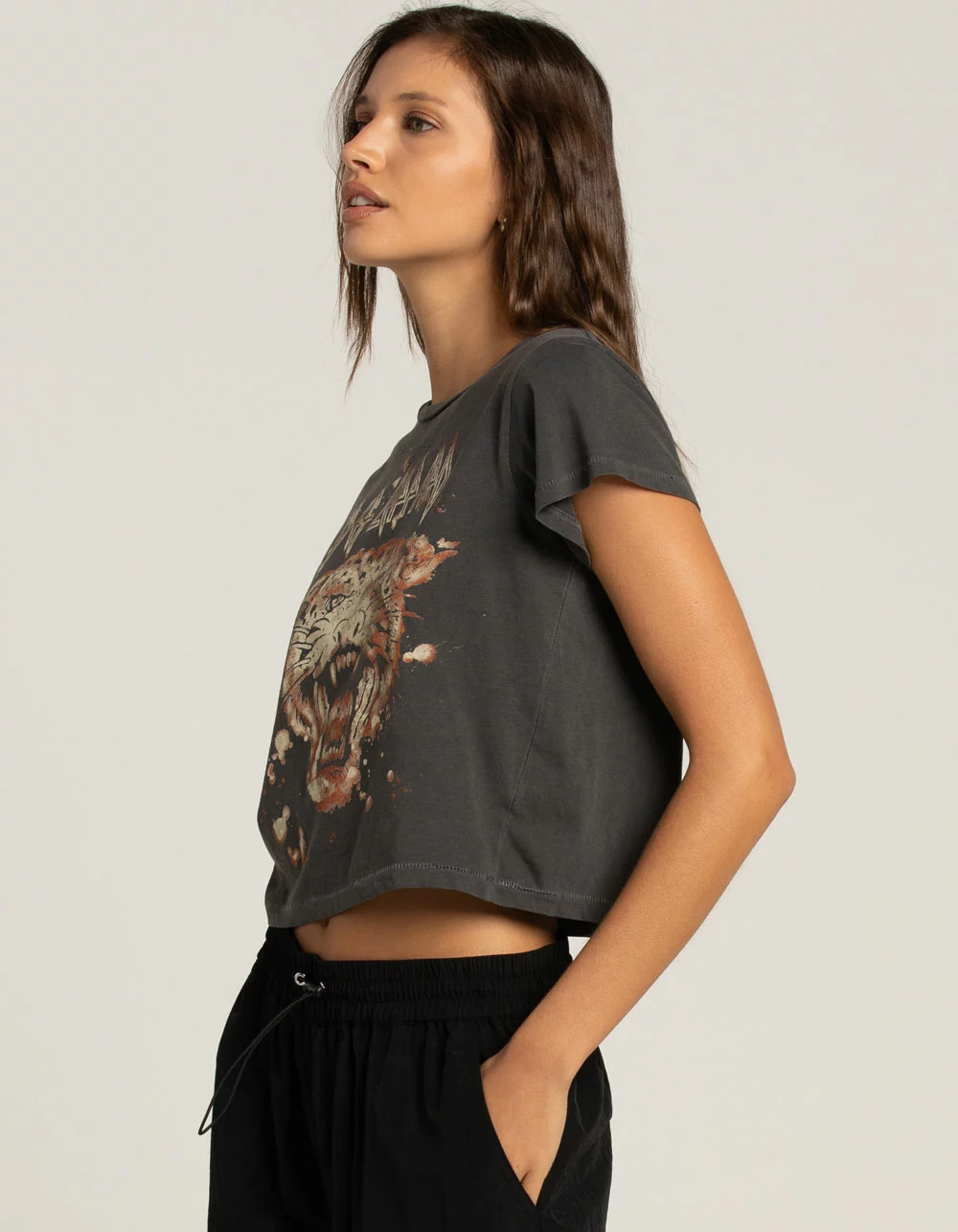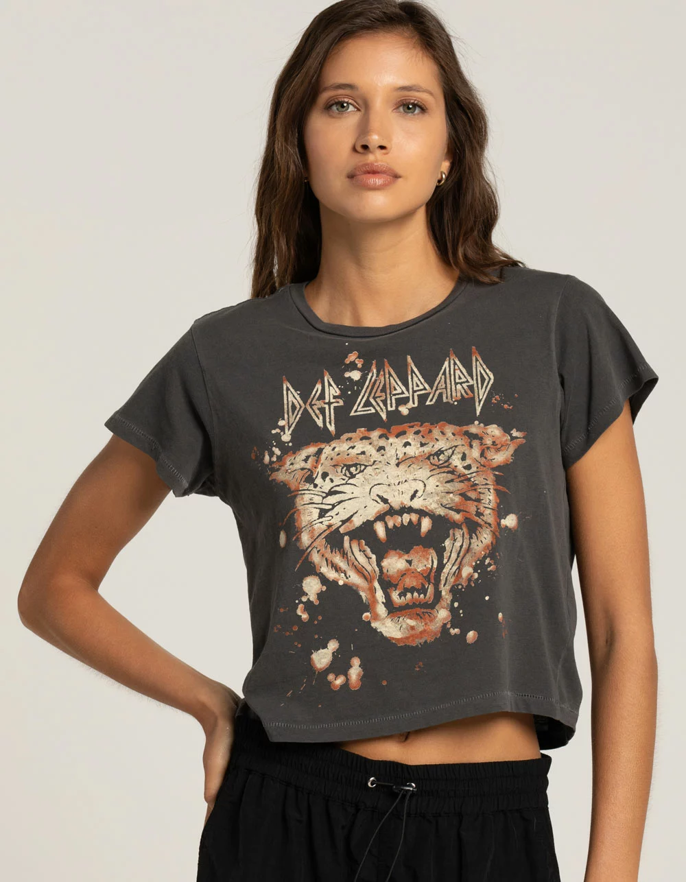 Def Leppard Baby Tee. Large graphic screened on front. Ribbed crew neckline. Short sleeve. Cropped fit. 100% Cotton. Machine wash. Imported.