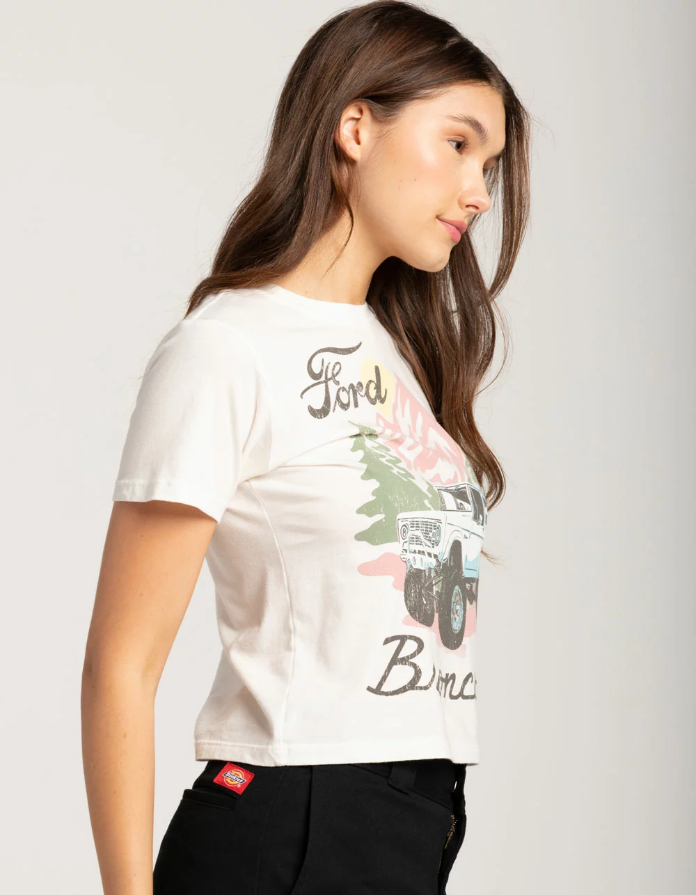 Ford Bronco Baby Tee. Large graphic screened on front. Ribbed crew neckline. Short sleeve. Boxy and cropped fit. 100% Cotton. Machine wash. Imported.