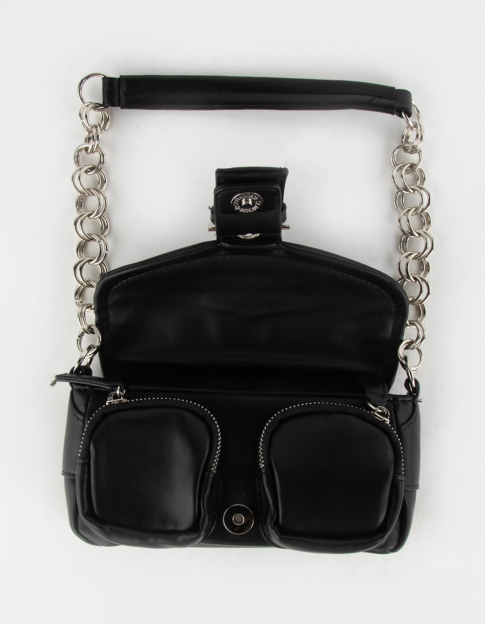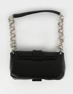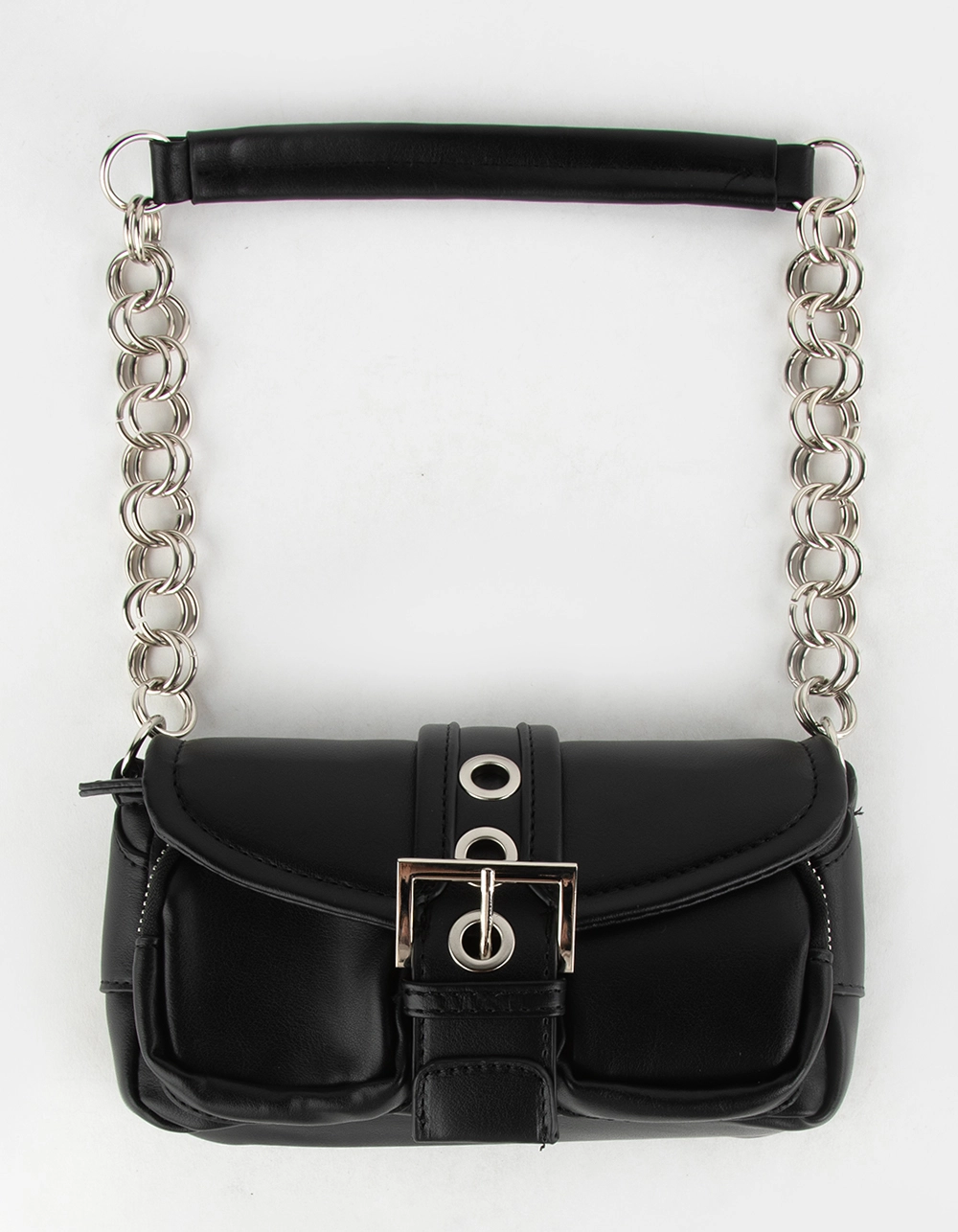 Grommet Chain Shoulder Bag. Gold tone zip closure on top. Organizer inside. Adjustable shoulder strap. 11.5” x 7.5”. Imported.