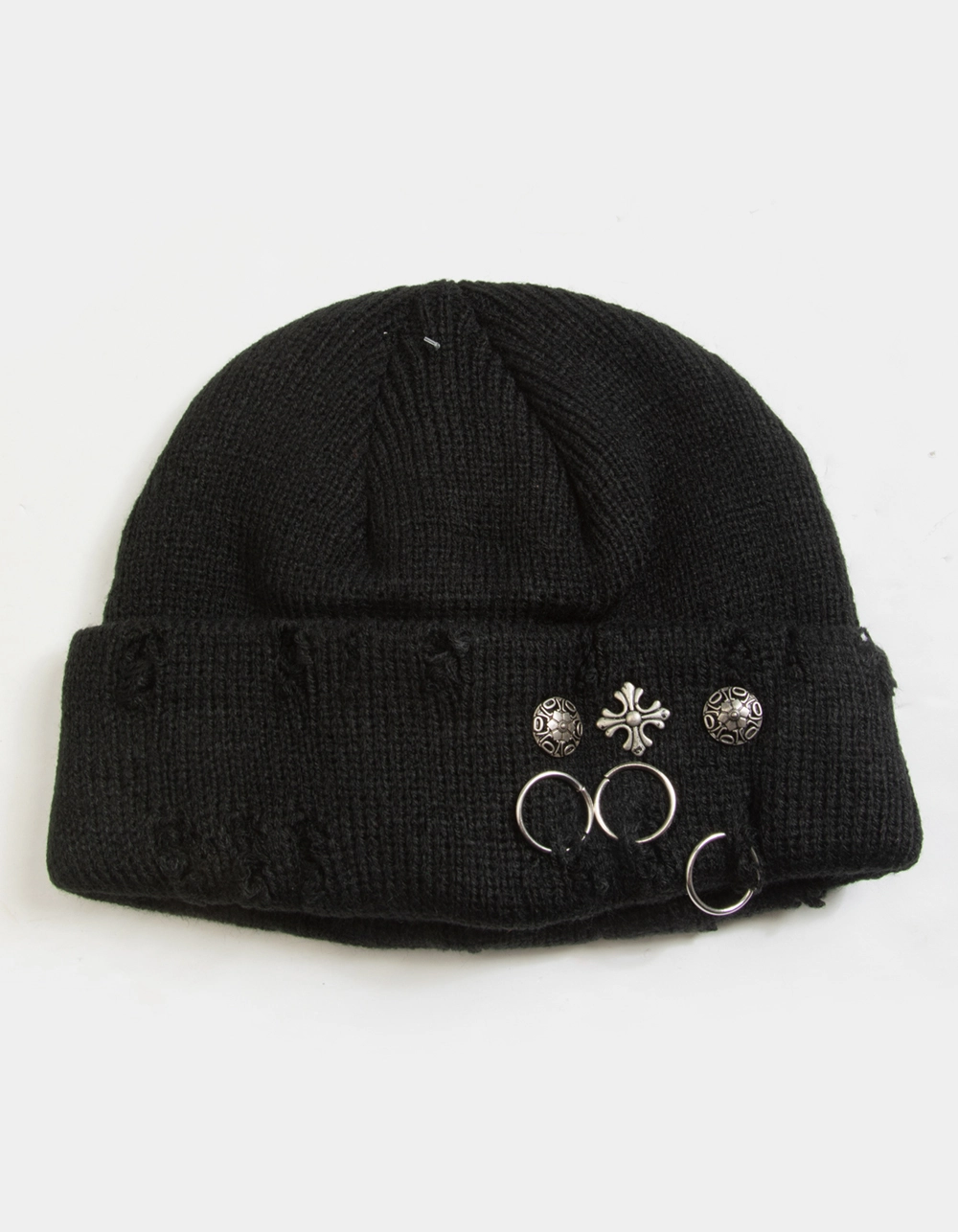 Hardware Beanie. Hardware detail at front cuff. Distressing along cuff. 90% Acrylic 10% Iron. Imported.