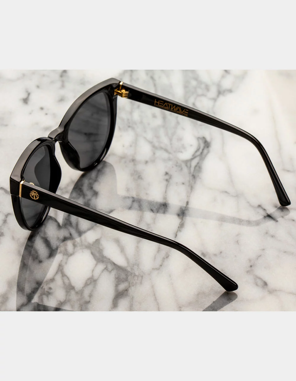 Heatwave Gold Carat Sunglasses. Introducing Heat Wave GOLD – A complete departure from the normal Heat Wave range with a dive into traditional eyewear construction, featuring gloss finishes, metal hinges and a high focus on details. Get ready for a wave of compliments, the Carat is the next generation in cat eye sunglasses, featuring modern flush mount, flat lenses set inside a timeless high gloss black frame with polished gold details. The finished look is something that stands apart from the rest, yet fits in from casual all the way up to cause trouble. The Carat is your new favorite daily driver. Gloss Black PC frames with metal core. 1.9 MM Flush mount lenses. Polished gold details. 5 barrel metal hinges. Meets ANSI Z80.3 requirements – UV400. 100% UVA / UVB blocking. Shatter-resistant polycarbonate lenses. Durable Polycarbonate frame construction. Imported.
