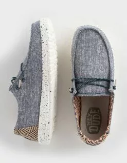 Hey Dude Wendy Chambray Shoes. Our most popular moc meets soft chambray-cotton throughout. The Wendy Chambray collection embodies the Hey Dude lifestyle by combining our passion for comfort and quality. Created with a soft, chambray-blend upper, finished off with an easy-on, elastic lacing system and an ultralight outsole for extra comfort. This design is perfect for all day wear. Flex & Fold Technology. Chambray-blend upper with contrasting, hand-stitched and heel detailing. Contrasting, cotton lining. Leather-lined, removable insole. Easy to wash, air dry. Imported.