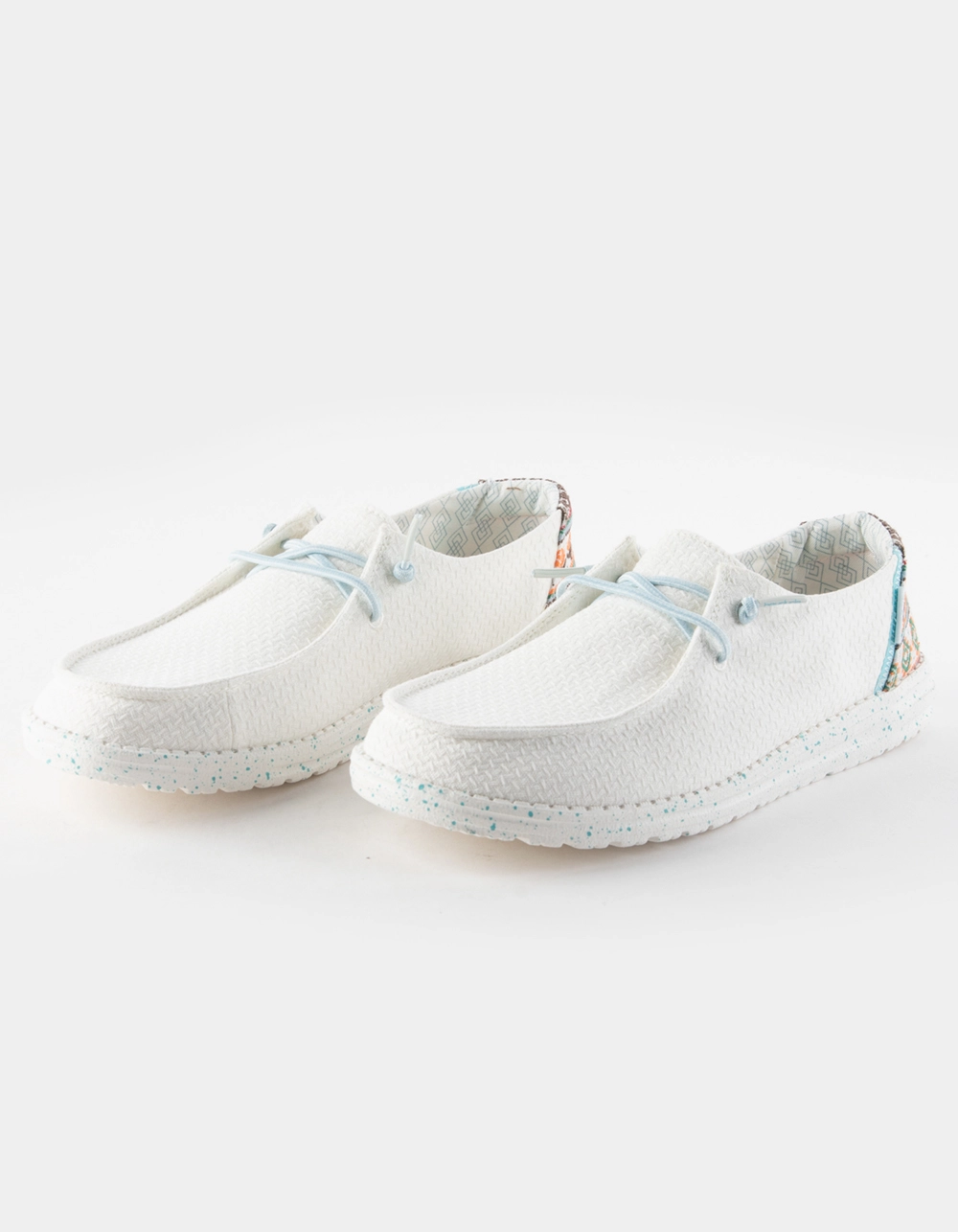 Hey Dude Wendy Shoes. The Wendy collection introduces our iconic low-top moc. A soft, breathable cotton canvas in an easy, neutral color and lined in fun prints for extra style points when you kick them off. Featuring an easy-on system with elastic laces and an ultralight outsole for all-day comfort. Flex & Fold Technology. Textured 8-ounce cotton canvas with contrasting heel detail. Contrasting, printed-cotton lining. Easy-On System with elastic laces. Ultralight outsole. Leather-lined, removable insole. Easy to wash, air dry. Imported.