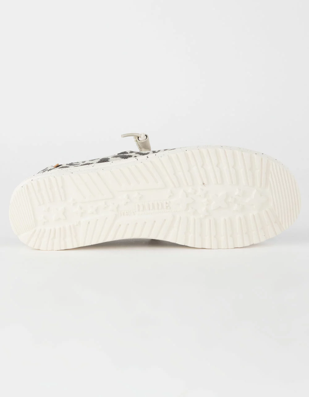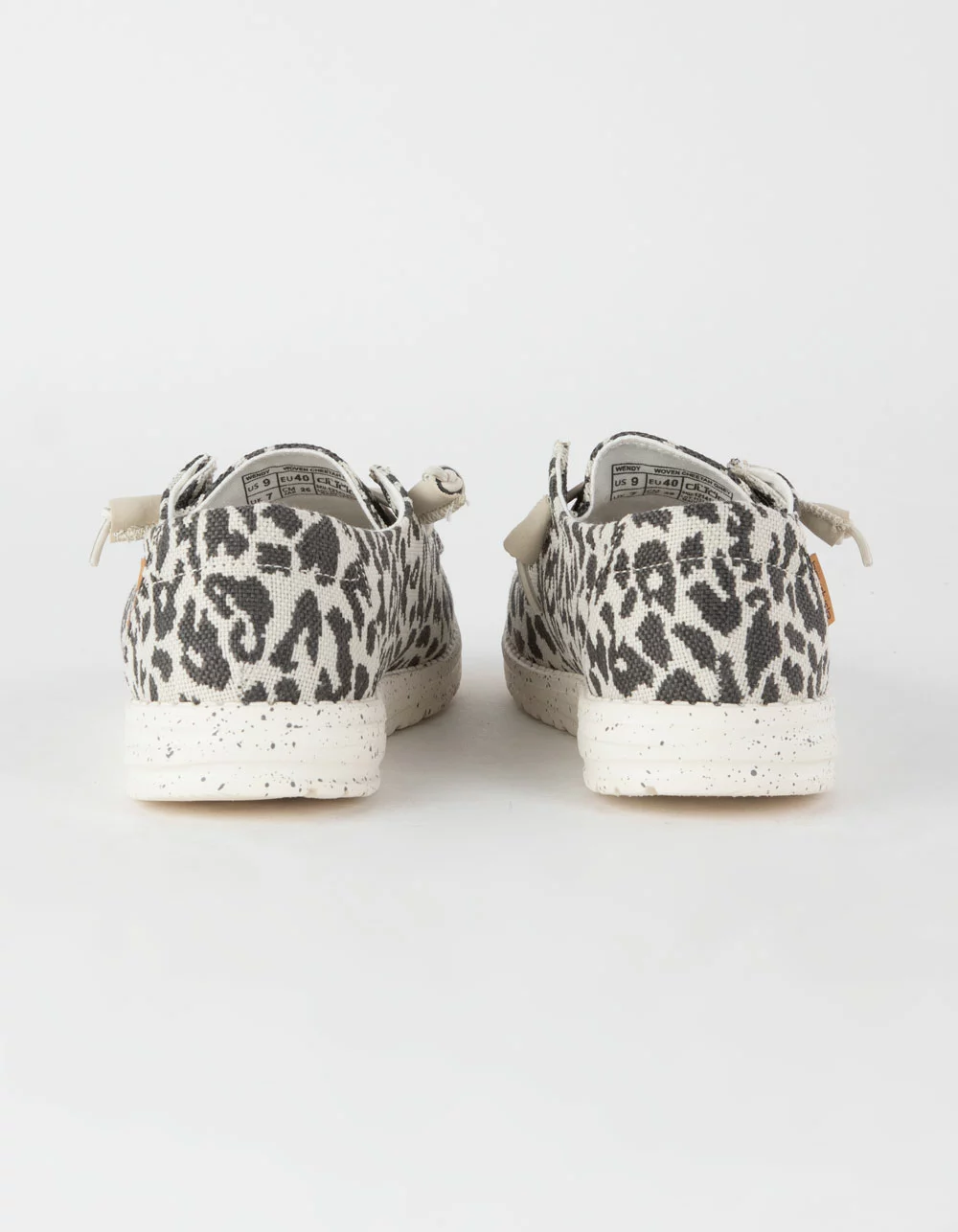 Hey Dude Wendy Woven Cheetah Grey Slip On Shoes. Step out into the wild with the Wendy Woven collection. A style designed with fun prints through a textured woven, polyester-blend upper for breathable comfort. Finished off with an ultralight outsole and an easy-on system with elastic laces. You’ll tackle any day with this exotic show stopper! Flex & fold technology. Polyester-blend upper with cheetah print.. Contrasting, cotton lining. Leather-lined, removable insole. Easy to wash, air dry. Imported.