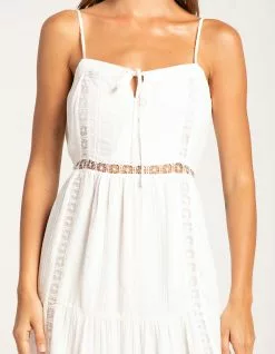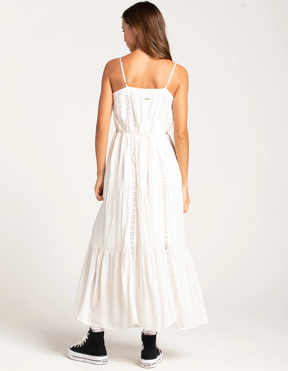 Hurley Alice Midi Dress. Button up bodice. Tie at neckline. Adjustable spaghetti straps. Elastic waist and ties at back. Lace detailing throughout. Loose and flowy fit. Built-in slip. Approx. length: 51”. 100% Rayon. Machine wash. Imported.