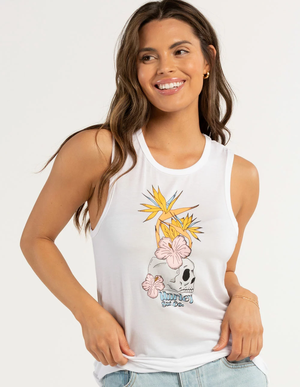 Hurley Birdies Muscle Tee. Large graphic screened on front. Crewneck. Ultra soft fabric. 95% Modal, 5% Spandex. Machine wash. Imported.
