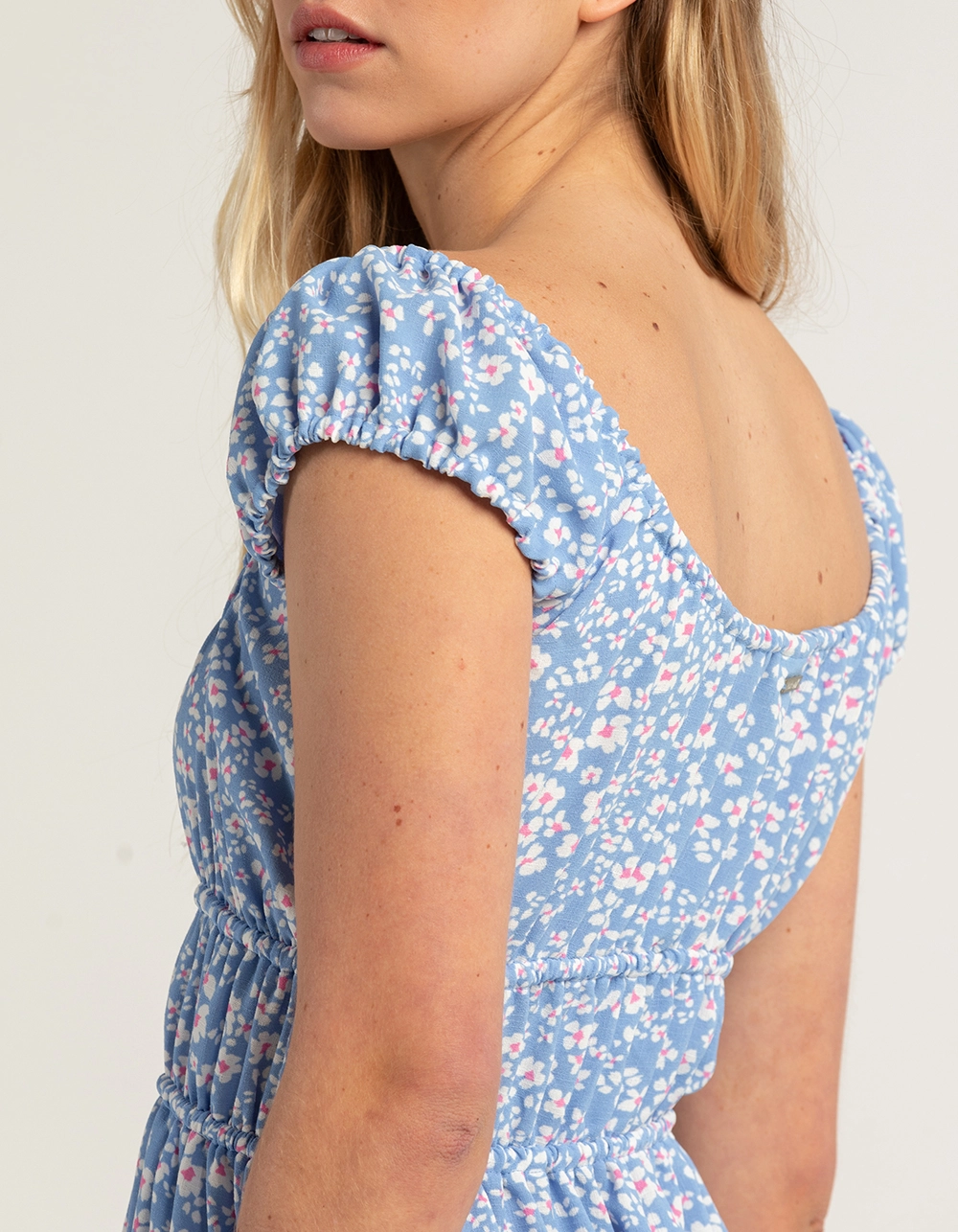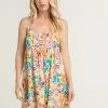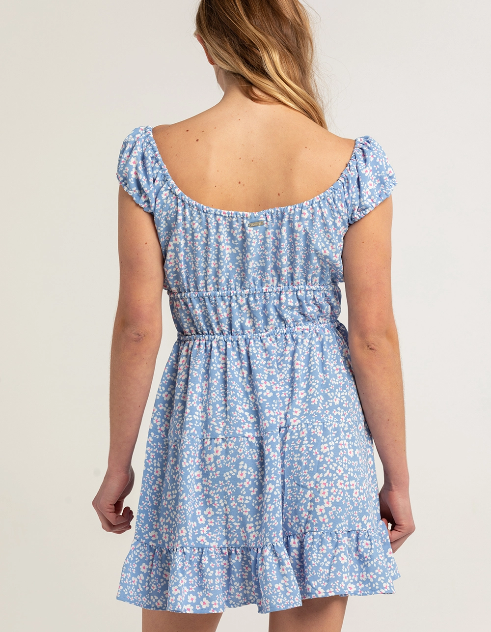 Hurley Ditsy Daze Mini Dress. Allover floral print. Elastic neckline. Dress can be worn on and off the shoulders. Elastic waist featuring ties to create a more cinched appearance. Ruffled hem. Approx. length: 33”. 100% Polyester. Machine wash. Imported.