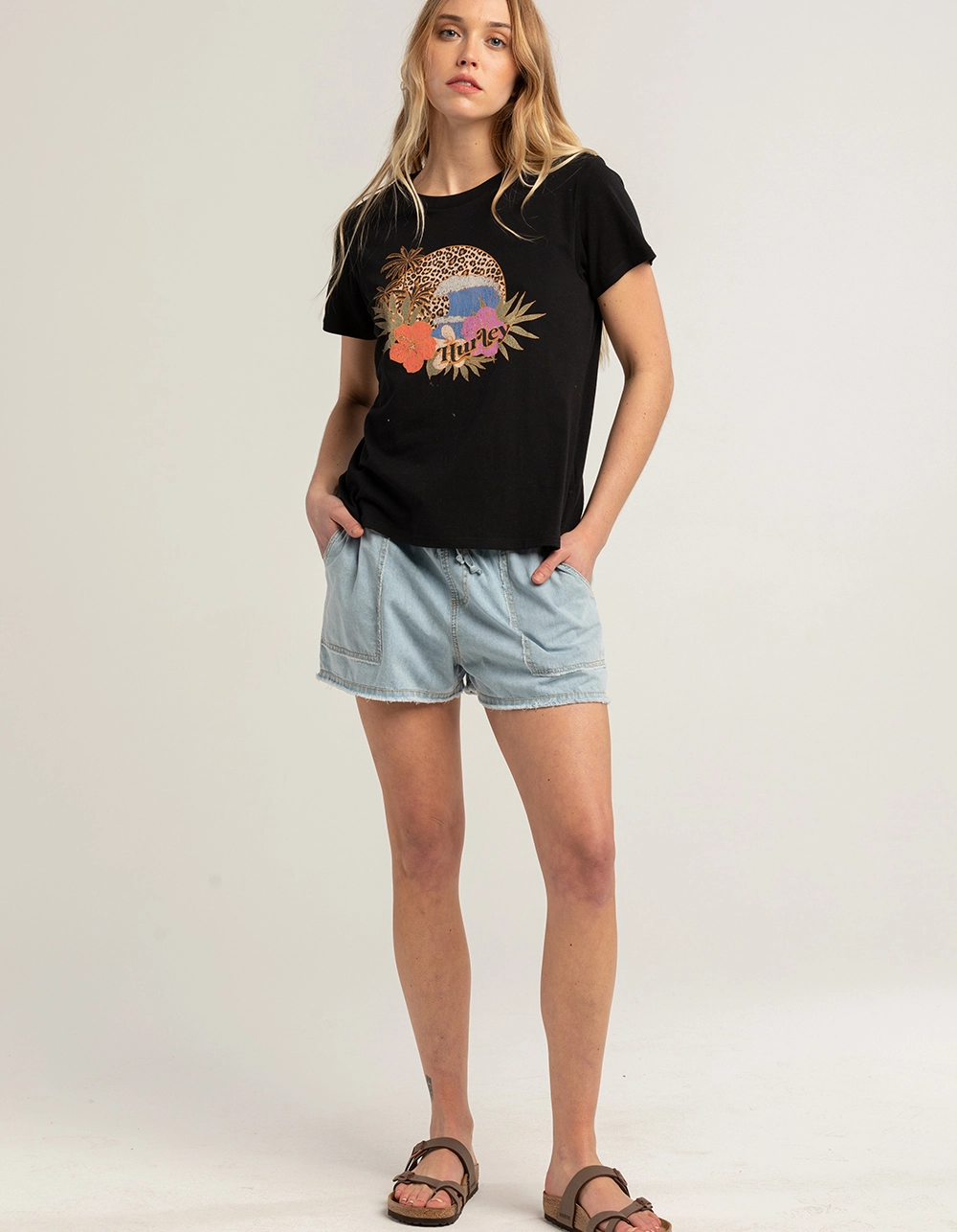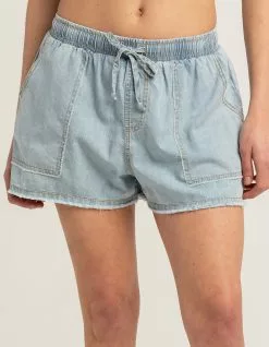 Hurley Kendra Pull On Shorts. Elastic waistband with drawstrings. Front patch pockets. Frayed hem. Light wash. Approx. inseam: 2.5”. 100% Cotton. Machine wash. Imported.