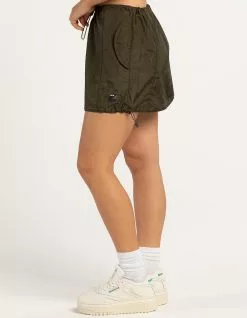 Iets Frans Baggy Tech Short Skirt. Crinkle nylon material. Elastic cord with adjustable toggle at waist. Adjustable toggles at hem, Side pockets with button closure. Silicone branding badge at hem. Approx. length: 14.5”. 100% Nylon. Machine wash. Imported.