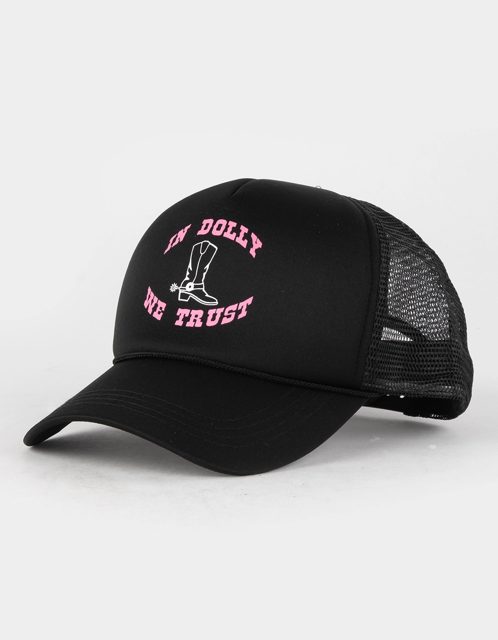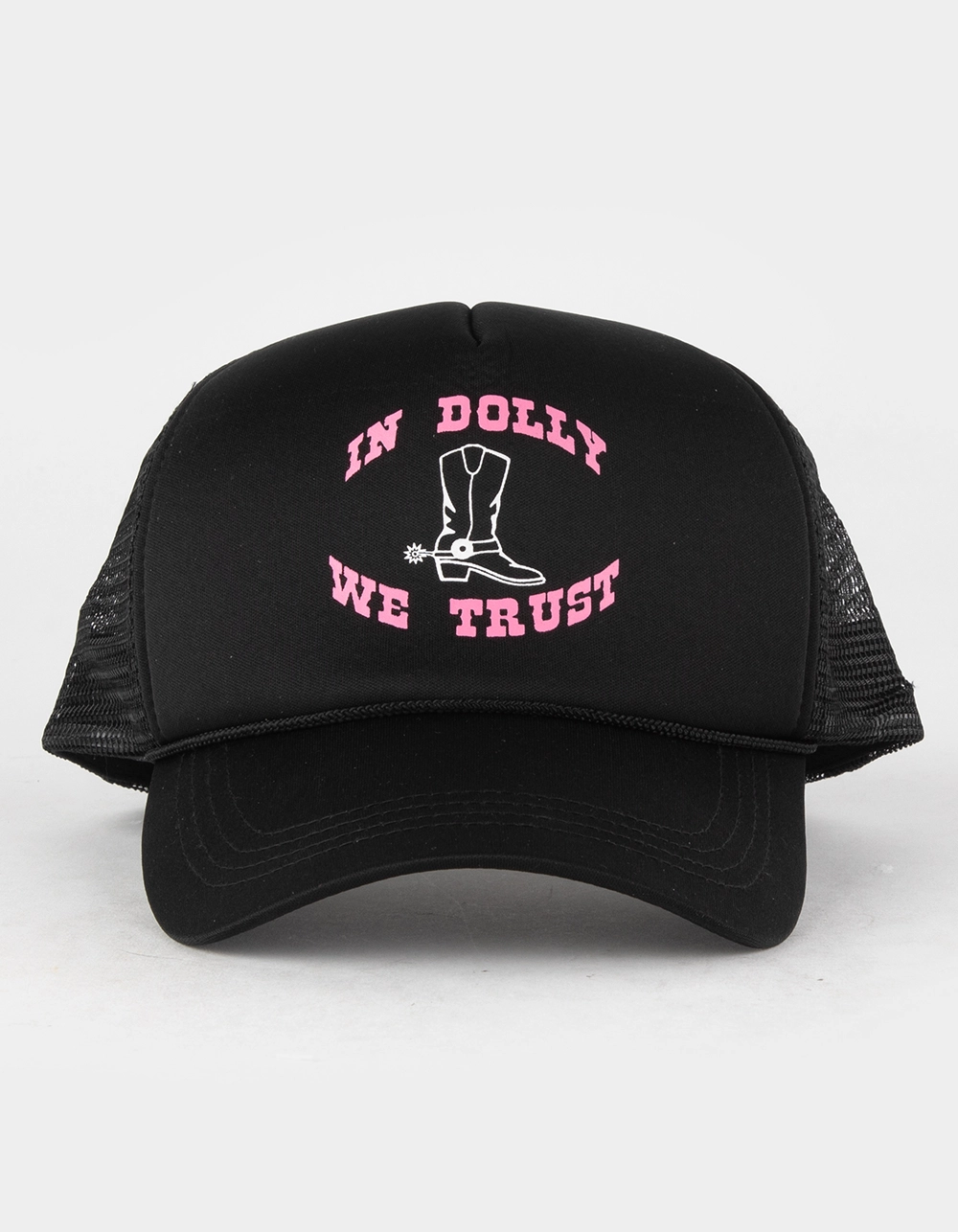 In Dolly We Trust Womens Trucker Hat. Graphic on front. Curved bill. Mesh back. Snapback closure. Imported.