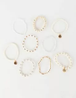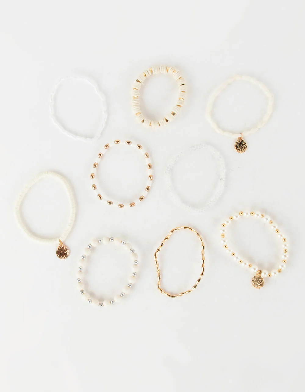 India Bracelet Set. Nine elastic beaded bracelets that can be worn together as a set, or mixed and matched. Silver and gold accents. Imported.