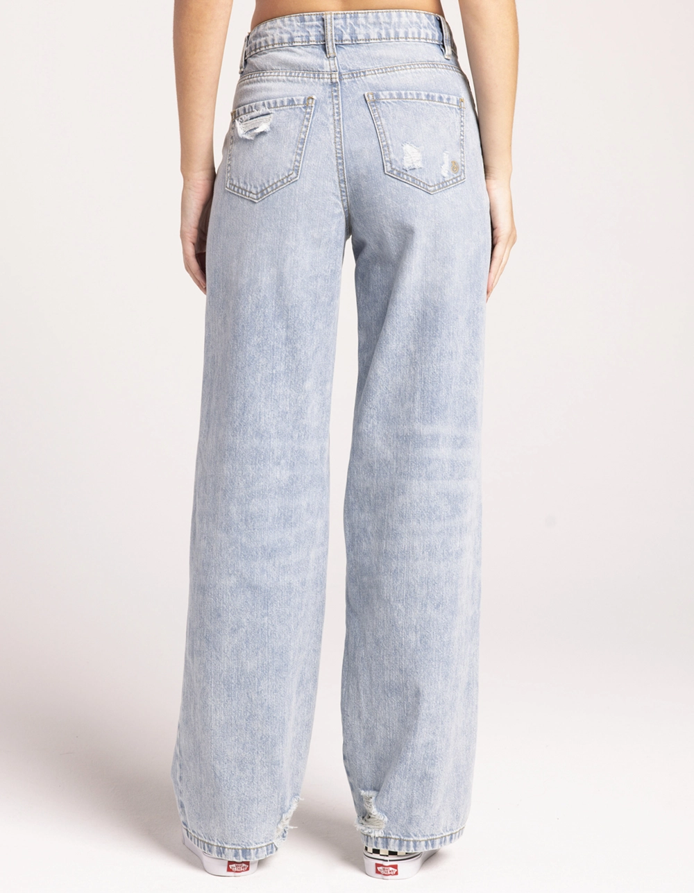 Indigo Rein High Rise Skater Jeans. Light wash. Distressing all throughout. High rise fit. 5-pocket styling. Belt loop waist. Button waist and zip fly. Approx. inseam: 32″. 100% Cotton. Machine wash. Imported.