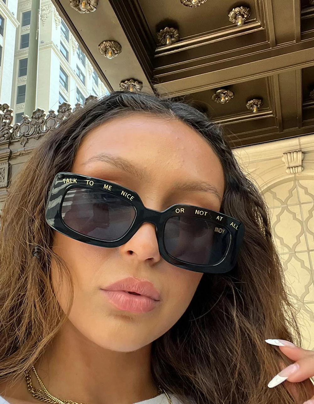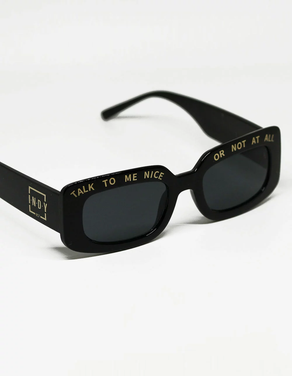 INDY Talk To Me Nice Sunglasses. Feeling spicy? Then these are for you. Whether you wear these on the subway, in front of your ex or for that Instagram selfie, you will look like a boss. The perfect unisex frame features gold laser text on the top of the frame + full UV protection. “These sunglasses are the embodiment of my 2022 energy” – Who What Wear. PC + UV400 sun protection. Text is permanent. Includes a box, a protective case and a cloth for cleaning.