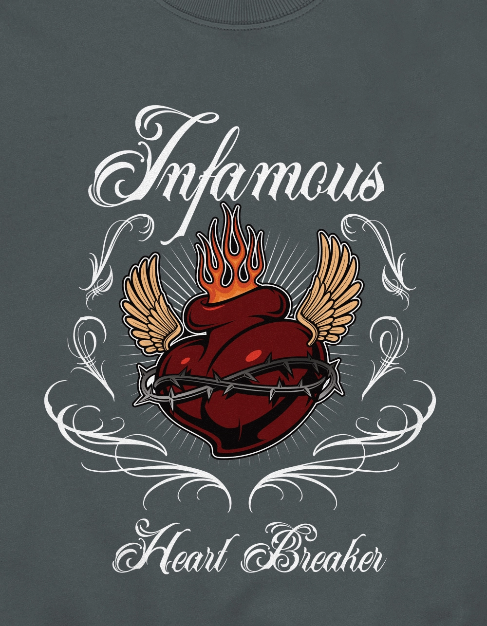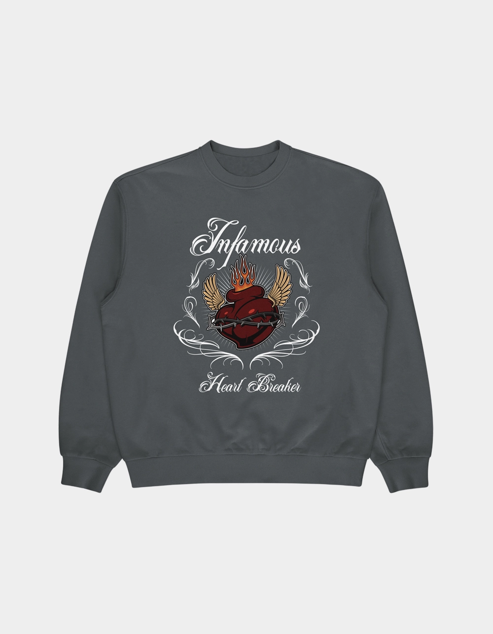 Set some hearts on fire with the Infamous Heart Breaker Crewneck Sweatshirt. Crafted to offer a classic fit, this long sleeve crewneck features a large graphic design and is made with a spun fabric blend for a softer feel. 50% Cotton and 50% Polyester. Printed in the U.S.A. This item is unisex fit and sizing.