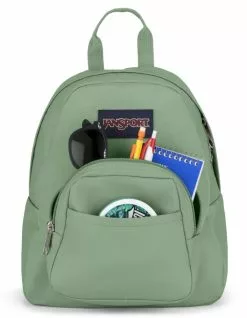 JanSport Half Pint Mini Backpack. Small and light, the JanSport Half Pint Mini Backpack is the perfect throw-on-and-go miniature backpack. Features adjustable shoulder straps, front utility pocket, one main compartment, web haul handle. Dimensions: 11.2 x 9.8 x 4.1. Imported.