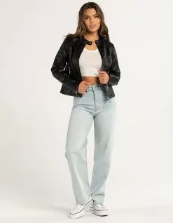 Jou Jou Vegan Leather Jacket. This Vegan Leather Jacket is a fashion statement; sitting right above the hips with front zipper closure. Front pockets with zipper closure. Zipper detailing on sleeves. Snap closure on neck. Shell: 100% Polyurethane. Lining: 100% Polyester. Wipe clean with damp cloth. Imported.