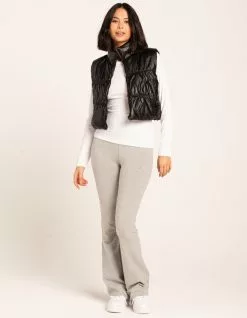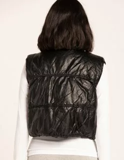 Know One Cares Puffer Vest. Turtle neck. Zip-up front. Sleeveless. Hidden side pockets with zipper closure. Drawcord hem to cinch at waist. 55% Polyurethane, 45% Cotton. Lining: 100% Polyester. Hand wash. Imported.