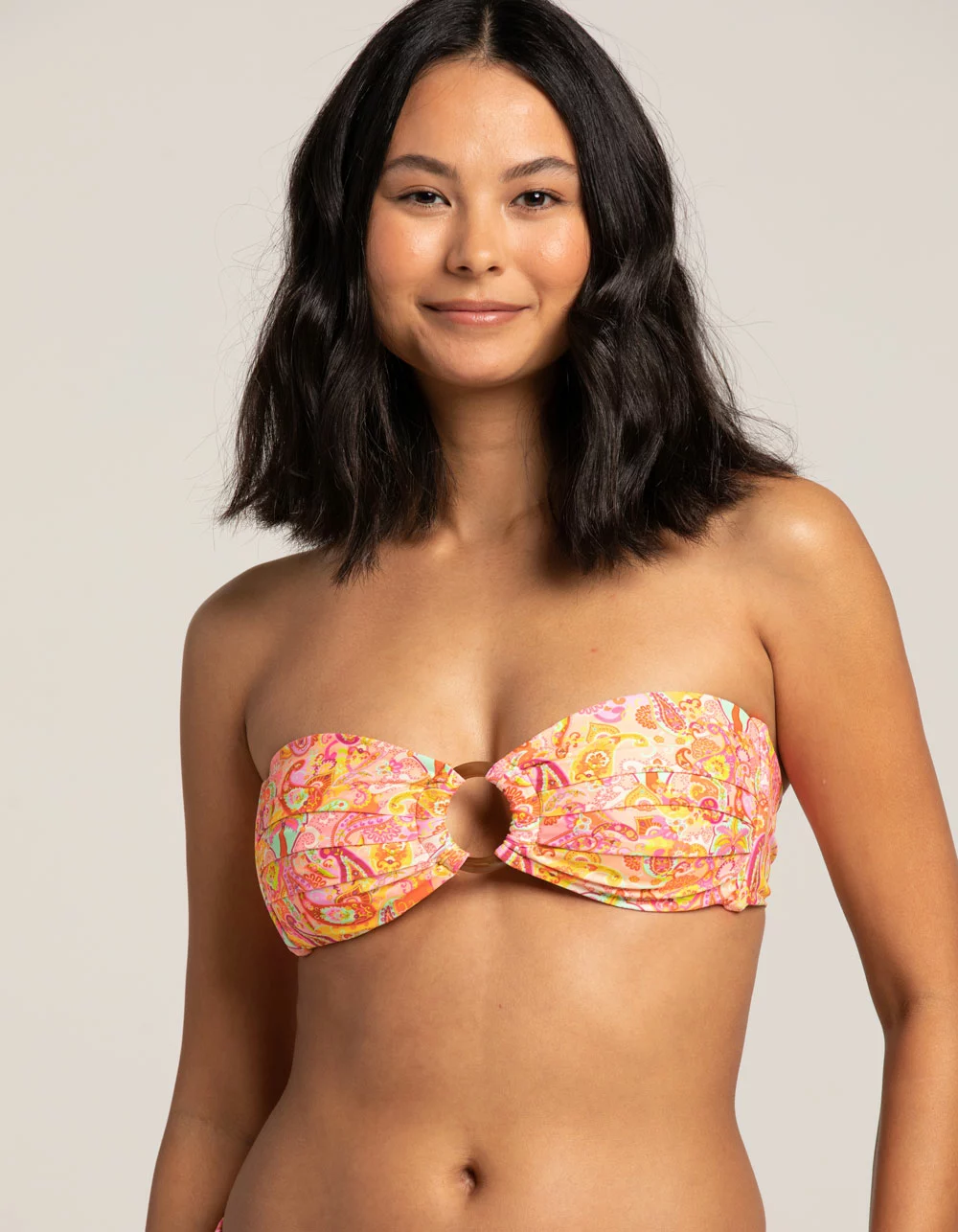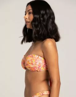 Kulani Kinis Bahama Rama Bandeau Bikini Top. This is a strapless tanning top style made to ensure no harsh tan lines are given while you are relaxing in the sun. Girls who buy this top aren’t worried about lift or support and say the ruched fabric over the cups provide some extra cover! Fully adjustable tie back to wear at your preferred tightness. Fabric feels glossy and buttery soft. Not padded and has no padding inserts or pocket space within. Breathable and fully lined with two layers of high quality fabric. Tortoise shell print front ring connector made of resin. 80% Polyester, 20% Elastane. Hand wash. Imported.