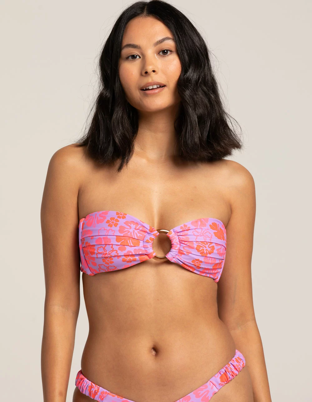 Kulani Kinis Cherry Berry Bandeau Bikini Top. This is a strapless tanning top style made to ensure no harsh tan lines are given while you are relaxing in the sun. Girls who buy this top aren’t worried about lift or support and say the ruched fabric over the cups provide some extra cover! Fully adjustable tie back to wear at your preferred tightness. Fabric feels glossy and buttery soft. Not padded and has no padding inserts or pocket space within. Breathable and fully lined with two layers of high quality fabric. Tortoise shell print front ring connector made of resin. 80% Polyester, 20% Elastane. Hand wash. Imported.