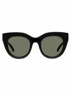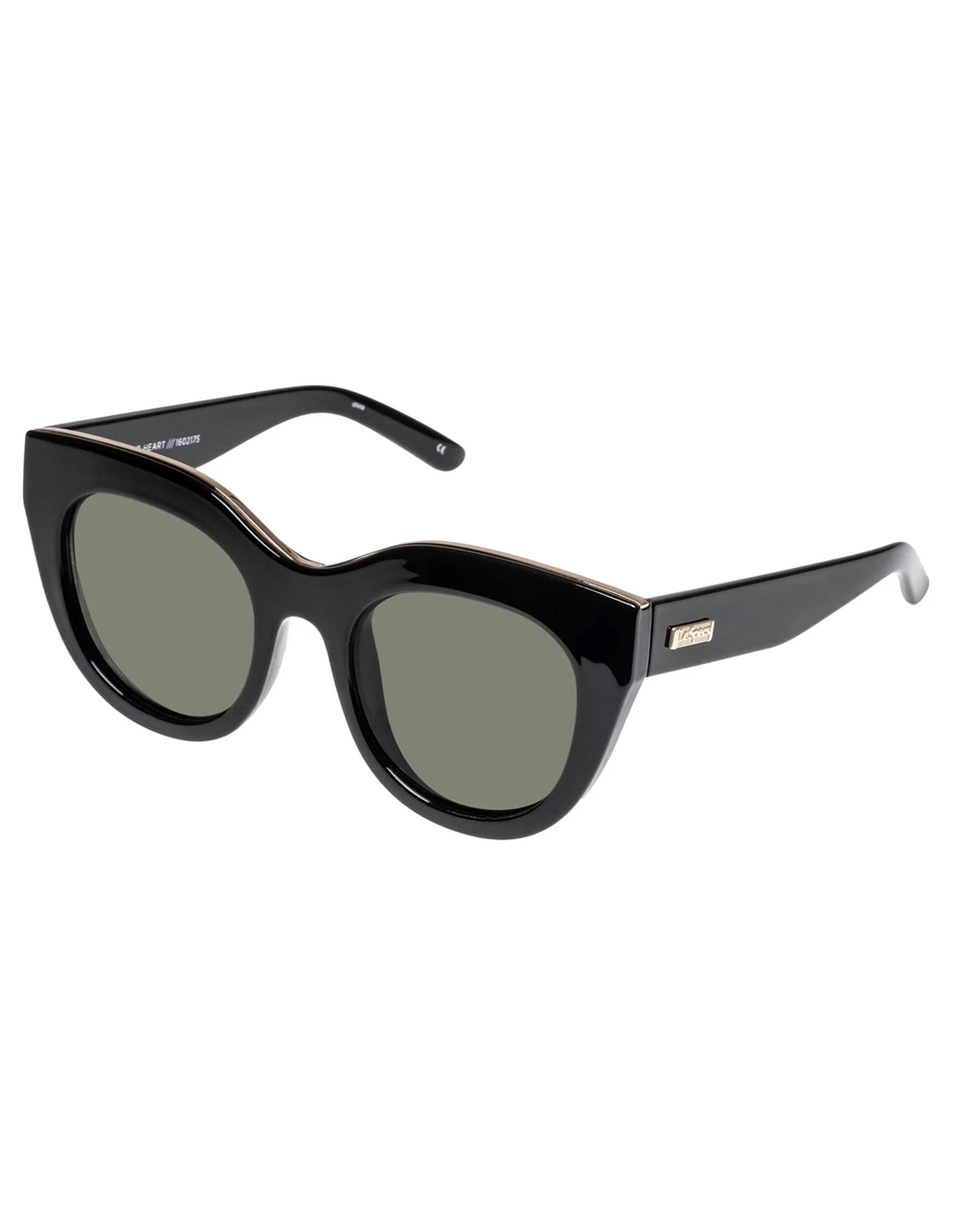 Le Specs Air Heart Sunglasses. A favourite of Meghan Markle and Olivia Palermo, the Air Heart silhouette is an iconic Le Specs style. With oversized and dramatic proportions reminiscent of a cat eye, the style is designed in thick black and luxurious metal top bar inlay, then fitted with premium zero base khaki flat lenses. Khaki mono lenses. Polycarbonate plastic. Imported.