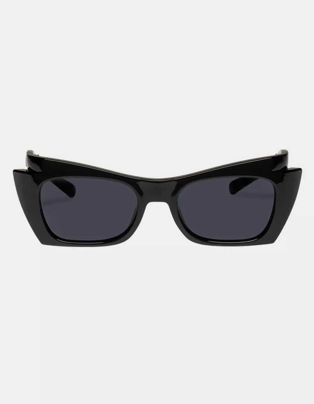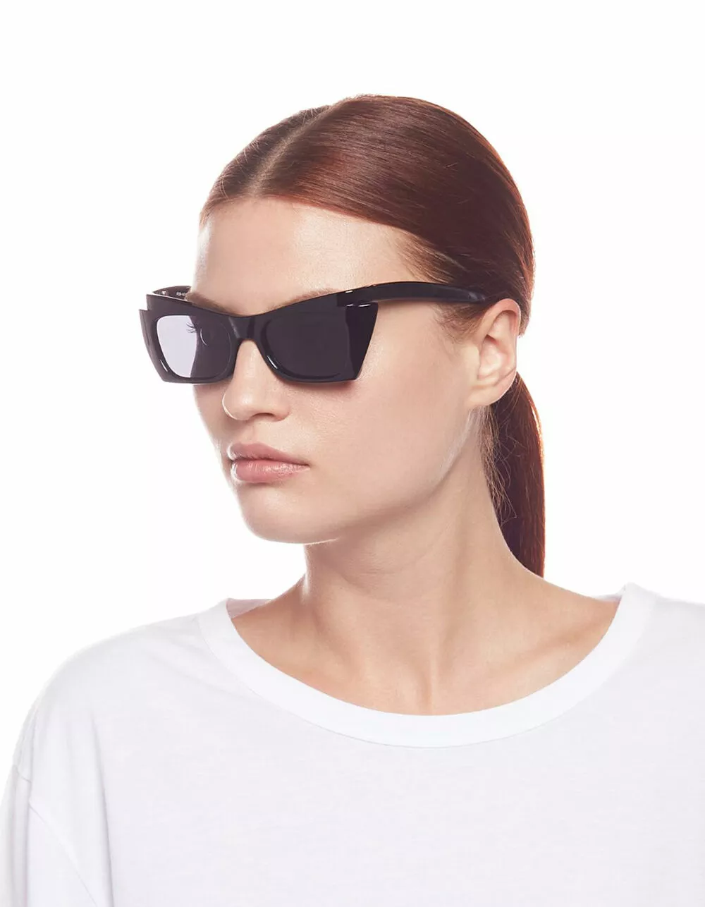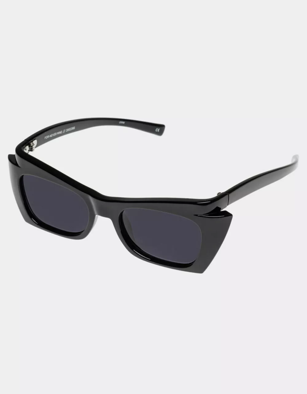 Le Specs For-Never Mine Sunglasses. With sleek curves and sharp angles, For-Never Mine in black is a confident modern cat-eye that features unique flicked out feminine edges – subtly branded with a gold Le Specs logo foil on the outer left temple tip. Cat eye shape. Polycarbonate plastic frames. Smoke mono lenses. Imported.