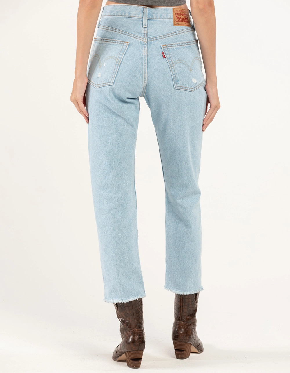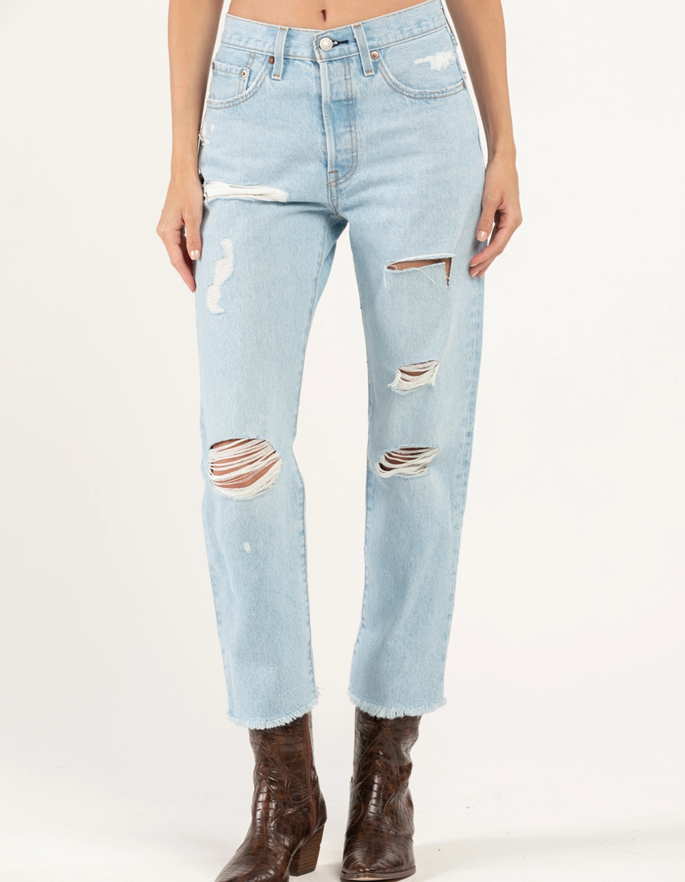 Levi’s 501 Crop Jeans. A forever classic, these jeans need no introduction. Our 501® Original Fit Jean was the first jean ever, and is still the ultimate blank canvas no matter how you dress. It’s our most iconic style — and has stayed true to itself for almost 150 years. With its signature straight fit and button fly, it doesn’t get more timeless than this. The original blue jean since 1873. A blank canvas for self-expression. Designed with the iconic straight fit and a signature button fly. All over destruction. Heavyweight Denim. Non-stretch. Button fly. 5-pocket styling. Raw hem. Approx. Inseam: 26″. 100% Cotton. Machine wash. Imported.