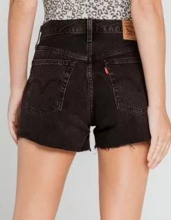 Levi’s 501 denim shorts. Traditional five pocket styling. Five-button waist and fly. Fraying at the leg openings and pockets. Levi’s label at the back waist. Approx rise: 10.5″. Approx inseam: 3″. 100% cotton. Machine wash. Imported.
