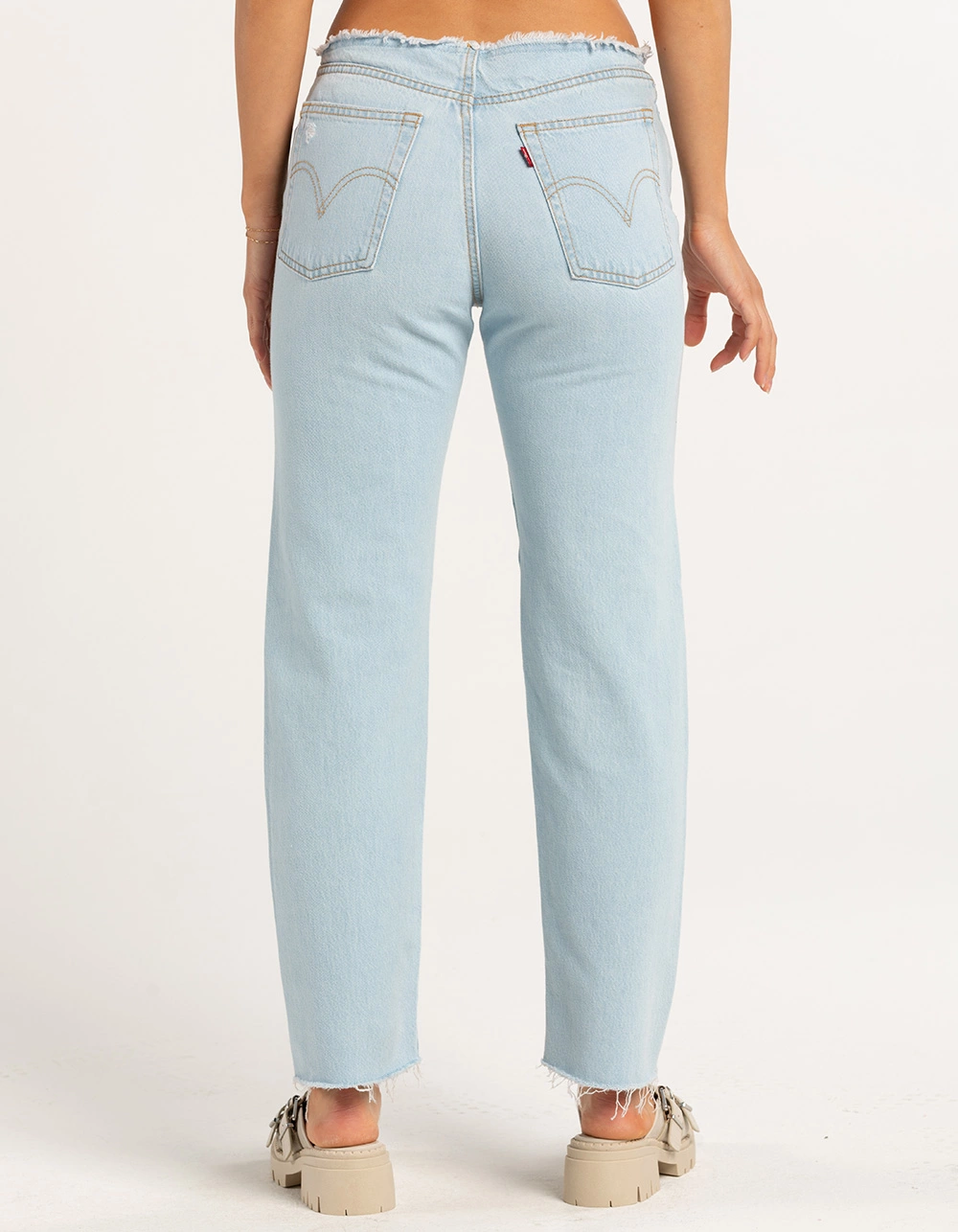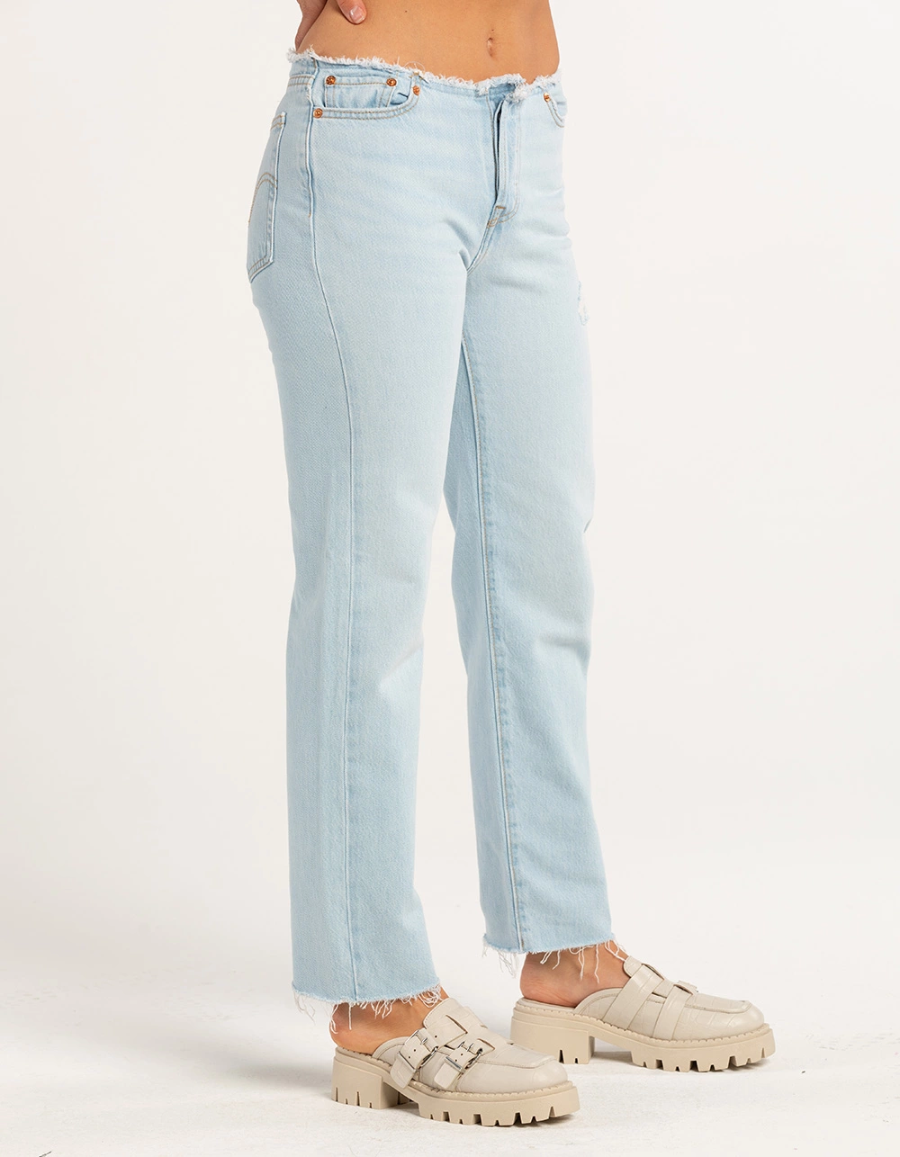 LEVI’S Wedgie Straight Jeans. Button fly with distressed and frayed waistband. Traditional five pocket styling. Slight distressing throughout. Tapered leg. Raw hem. Approx. inseam: 28”. 100% Cotton. Machine wash. Imported.