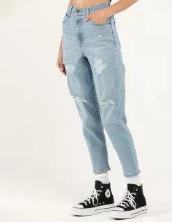 Levi’s High Waisted Mom Jeans. Belt loop waist. Button closure paired with zipper fly. Traditional 5 pocket design. High waisted mom jeans. Tapered leg opening. Custom rips on front. Approx. inseam: 26″. 86% Cotton 13% Polyester 1% spandex. Machine wash. Imported.