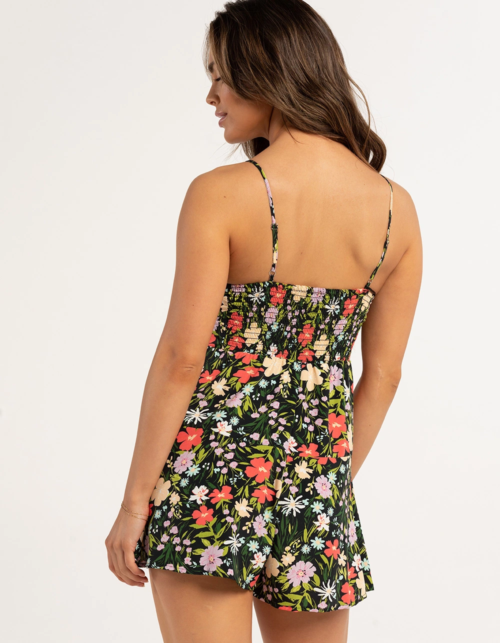Love Tree Emma Print Romper. Allover floral print. Shirred scoop neckline. Adjustable spaghetti straps. Loose and flowy fit. Smocked back. 2.5” inseam. 100% Polyester. Hand wash. Imported.