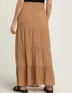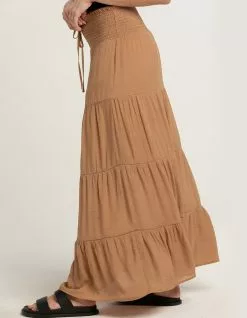 Love Tree Tiered Maxi Skirt. Wide elastic waistband with tie. Smocked waist. Tiered skirt. Built in slip. Approx. length: 39”. 65% Rayon, 35% Polyester. Lining: 100% Polyester. Hand wash. Imported.