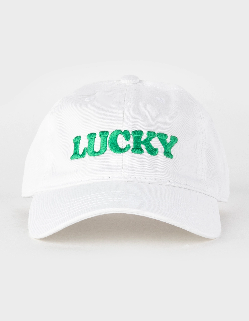 Lucky Strapback Dad Hat. Curved adjustable strapback with raised embroidery on the front. Relaxed fit. Fabric strap closure. 100% Cotton. Machine wash. Imported.