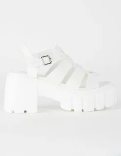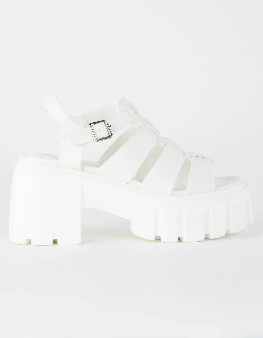 Madden Girl Genesis Cage Platform Sandals. The Genesis Cage sandal has a classic fisherman strap design over a heavily treaded platform sole. Buckle closure at ankle strap. 3-1/4″ block heel. 1-3/4″ platform. Square toe. Synthetic uppers, lining and sole. Imported.