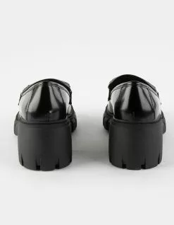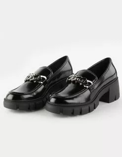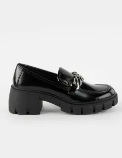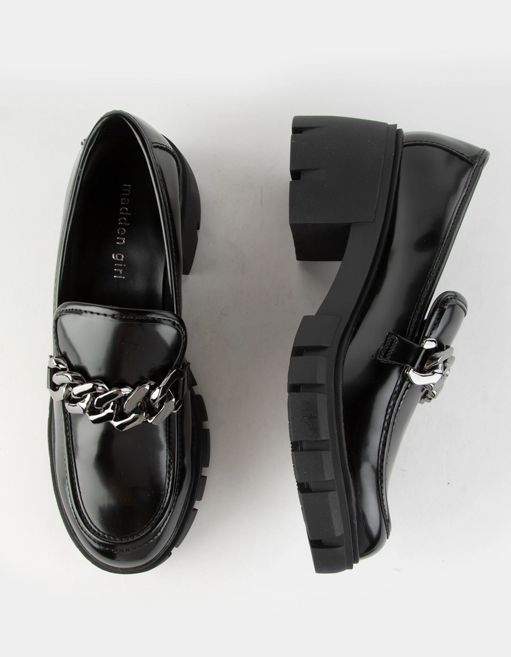 Madden Girl Hoxtonn Loafer. Leather upper. Lug sole. Chain detail on upper. Lug sole. Approx. 2.75″ Heel Height. Imported.