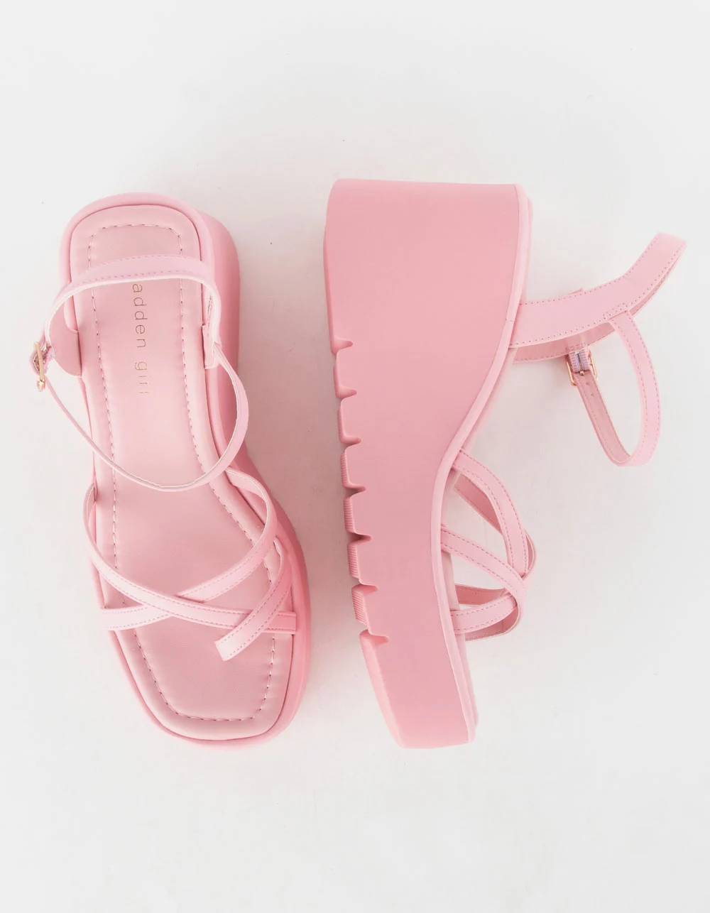 Madden Girl Vaultt Wedge Sandals. Get Madden Girl chic in these strappy wedges, with a comfortable, chunky platform to keep you dancing all night long. Buckle closure. Medium width. 3.25″ heel. Imported.