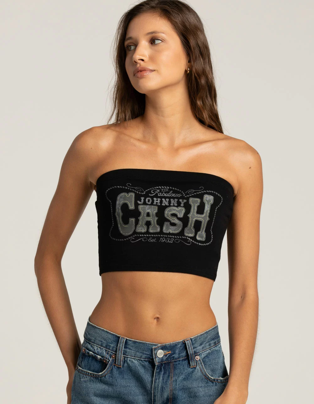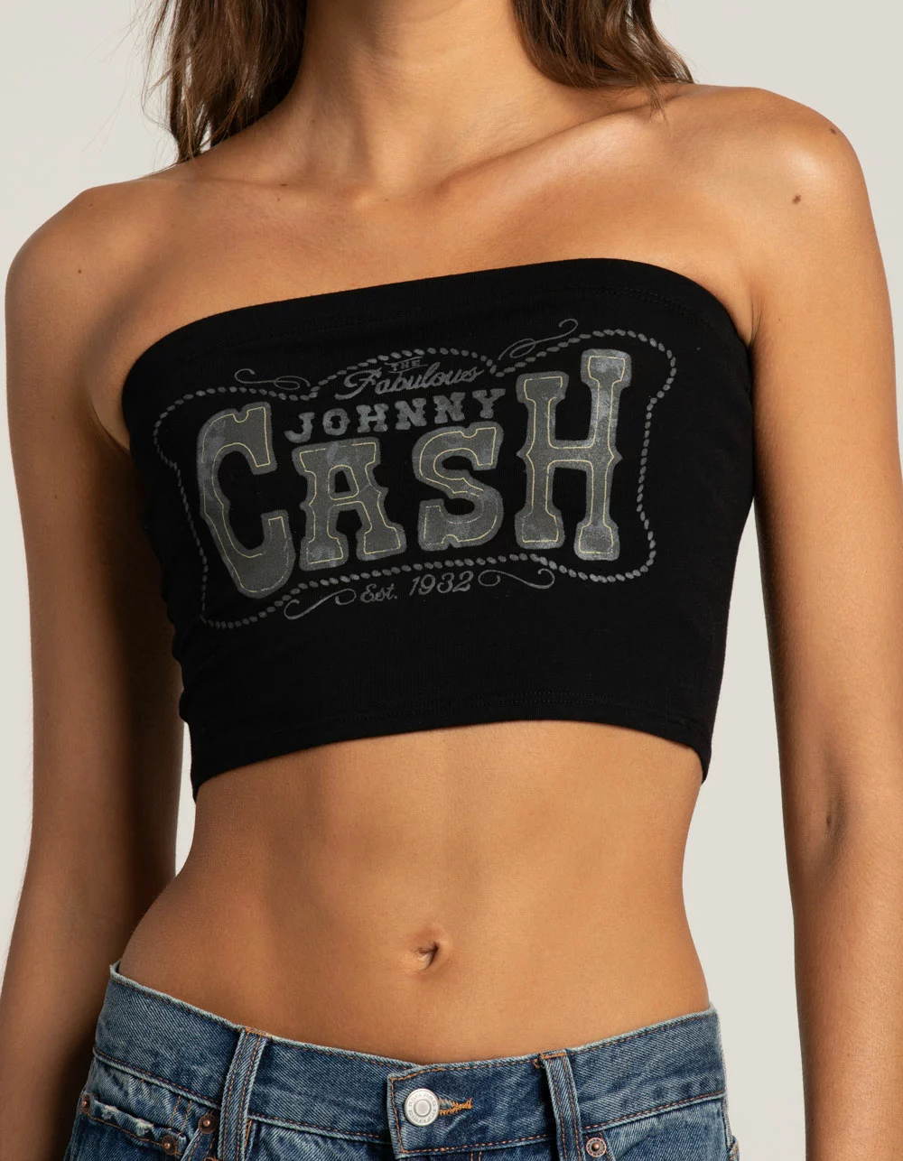 Johnny Cash Tube Top. Large graphic screened on front. Solid color. Sleeveless. Cropped fit. 95% Cotton, 5% Spandex. Machine wash. Imported.