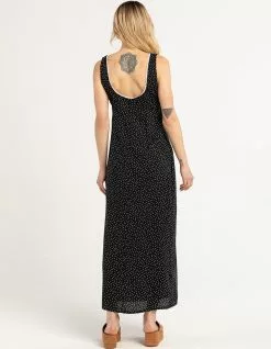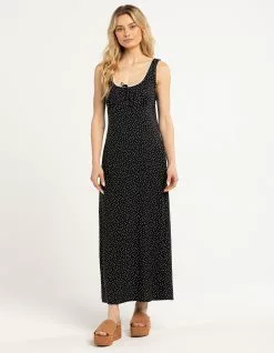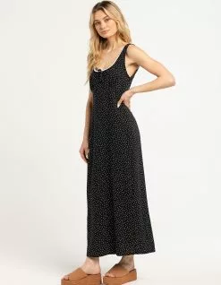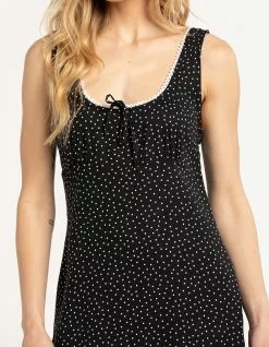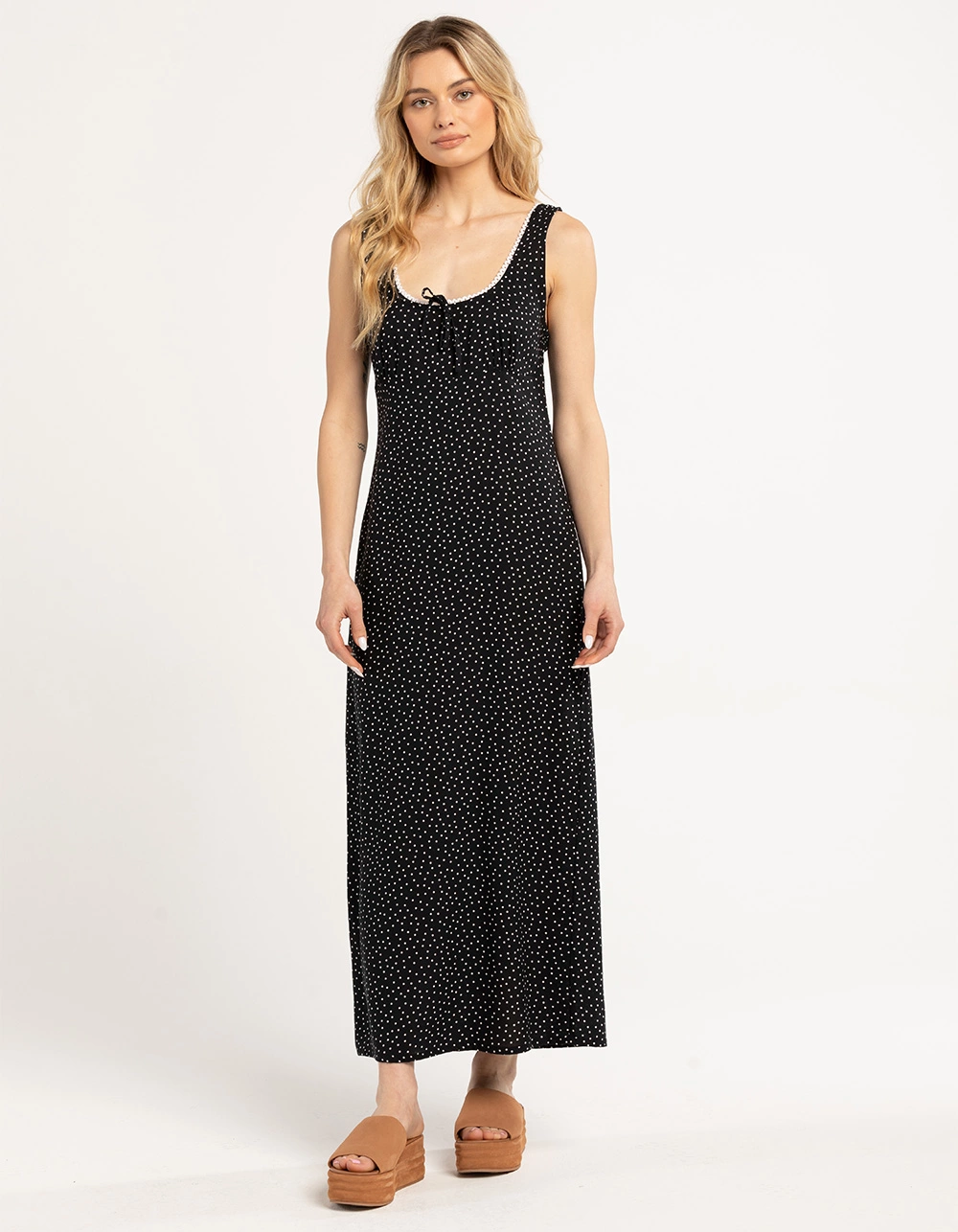 Motel Aralia Maxi Dress. Allover polka dot print. Scoop neckline featuring lace trim. Tie at center chest. Fixed shoulder straps. Hidden zipper at back, Approx. length: 52.5”. 100% Viscose. Hand wash. Imported.