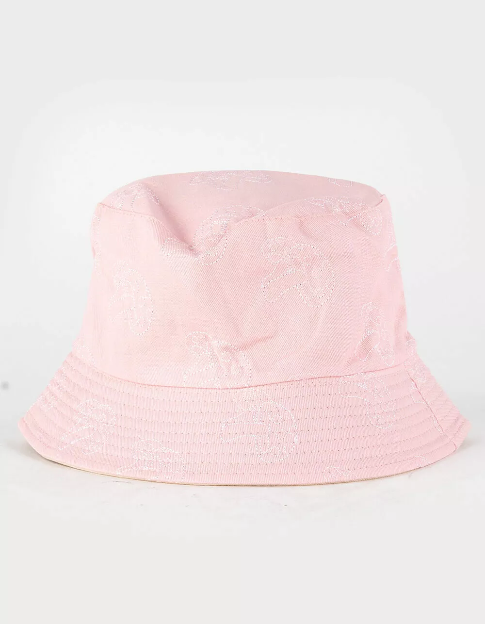 Mushroom Stitch Bucket Hat. Allover mushroom embroidery. Approximately 2″ brim. 100% Cotton. Imported.